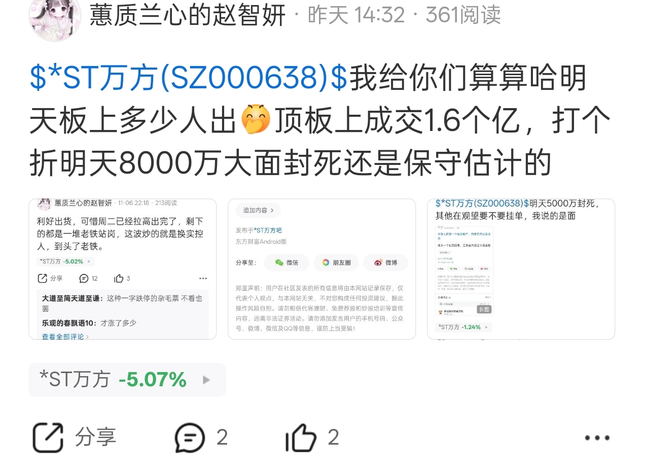 温馨提示: 1.根据《证券法》规定,禁止编造、传播虚假信息或者误导性信息,扰乱证券市场;2.用户在本社区发表的所有资料、言论等仅代表个人观点,与本网站立场无关,不对您构成任何投资建议。用户应基于自己的独立判断,自行决定证券投资并承担相应风险。《东方财富社区管理规定》