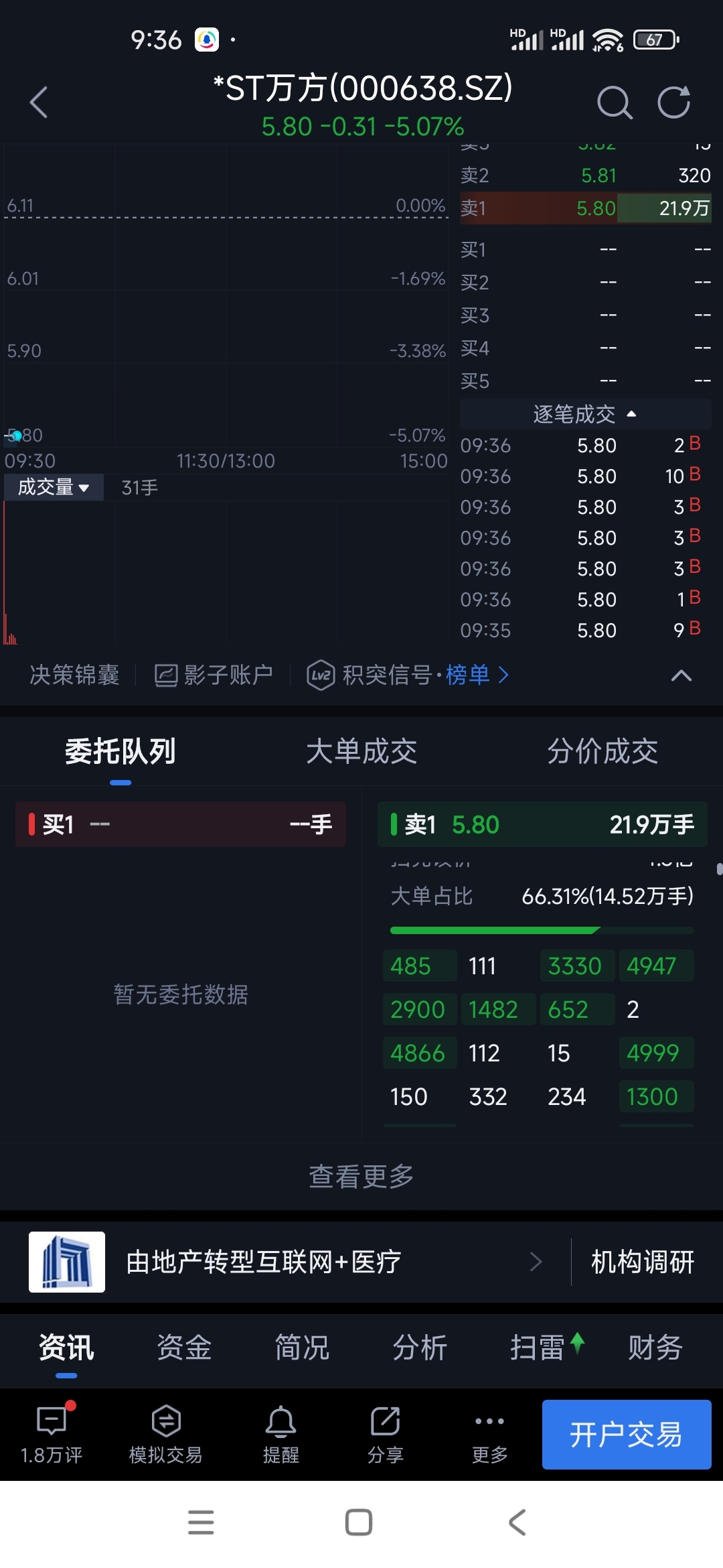 $*ST万方(SZ000638)$ 这个全是大单堵门了。这主力没格局,大家别挤了!