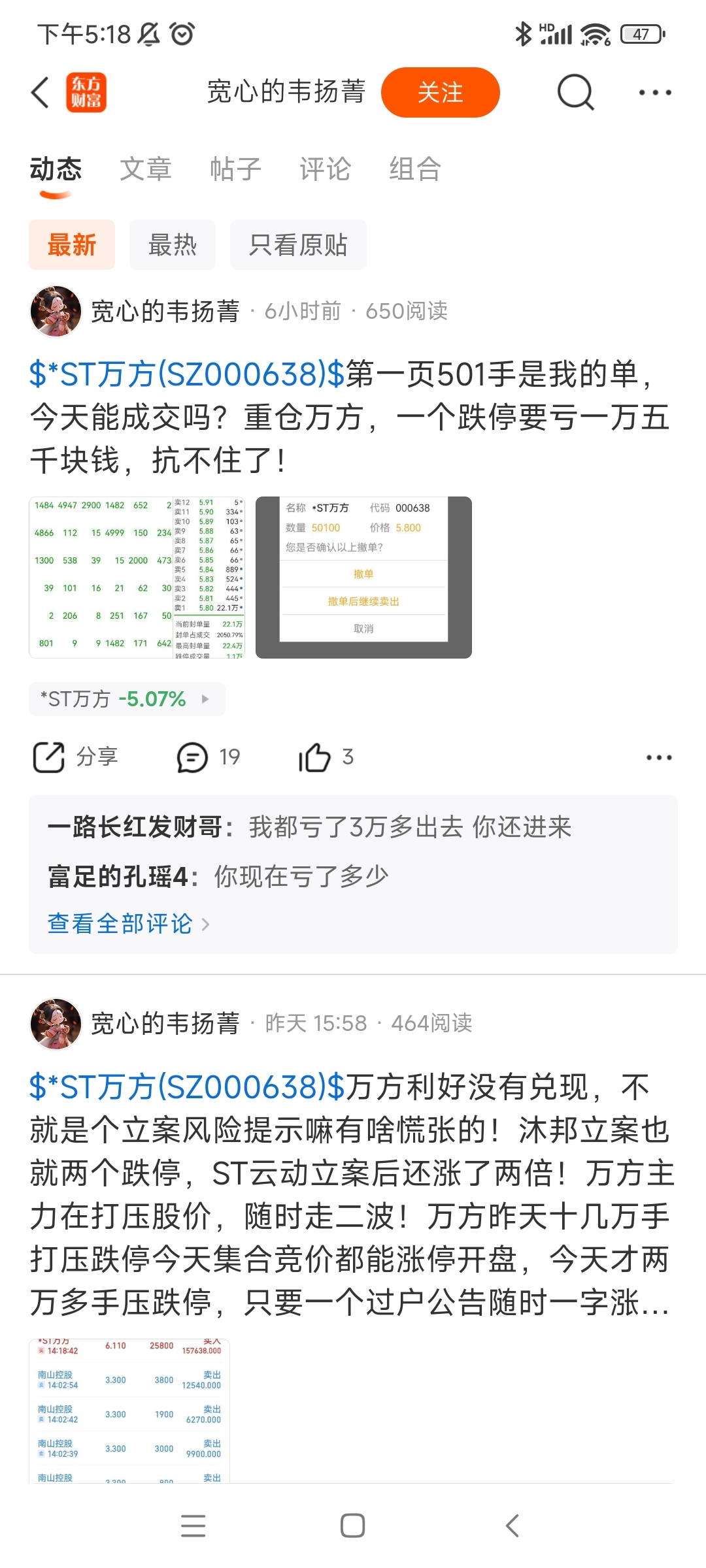 $*ST万方(SZ000638)$ 这个韦杨菁太搞笑了,昨天信心十足的卖了别的股抄底万方,还长篇大论说买的理由,原来晚上就挂隔夜单委托卖出了,还排第一页,今天没卖出去还在疯狂唱空,虽然我持仓不多,才6万多元,但一股没挂卖出,知行合一,预期还在,等跌停到周一我7万资金到账再补仓$ST新华锦(SH600735)$ $*ST亚振(SH603389)$