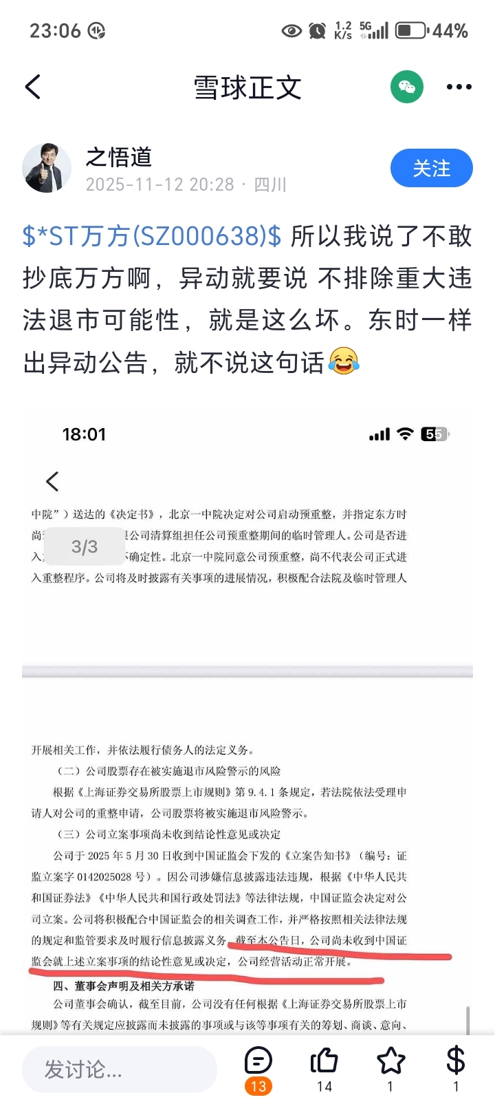 $*ST万方(SZ000638)$ 唉,绝望了。给万方站台的居然大部分都是这种货。一个是其他风险,一个是退市风险,还说别个其他风险,为什么不加这句话?这种货能有几千粉,难道是买的吗?