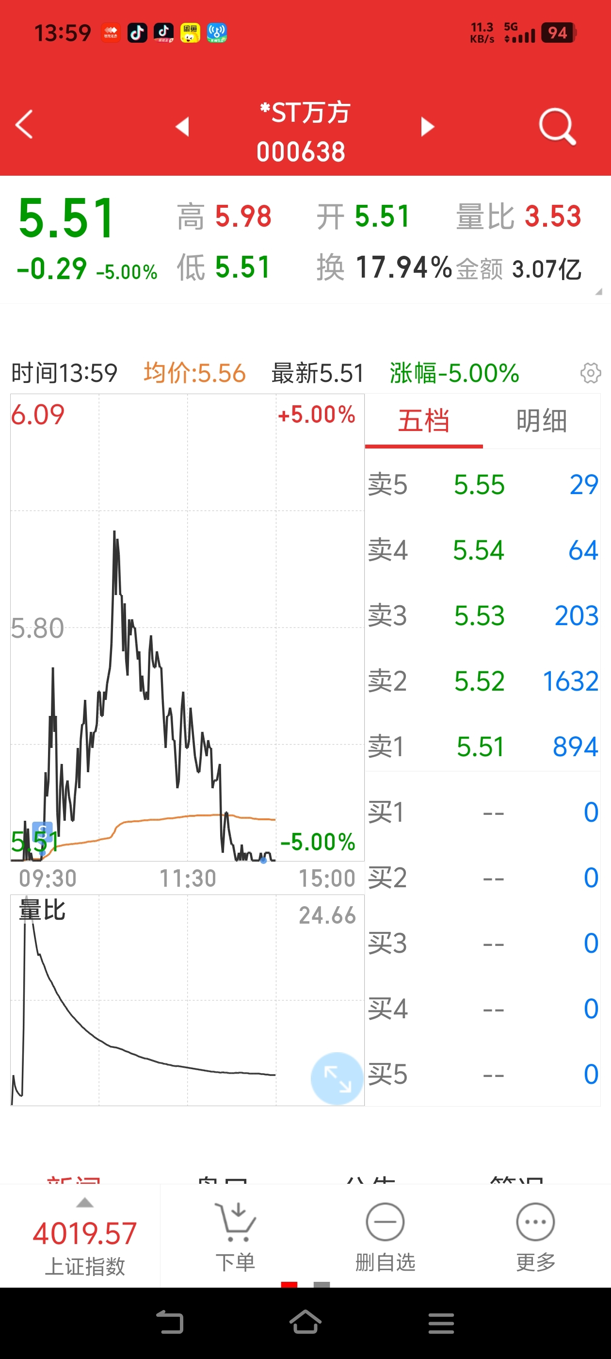 $*ST万方(SZ000638)$ 全部跌停价割完了,全是泪,以后打死不搞万方,拜拜