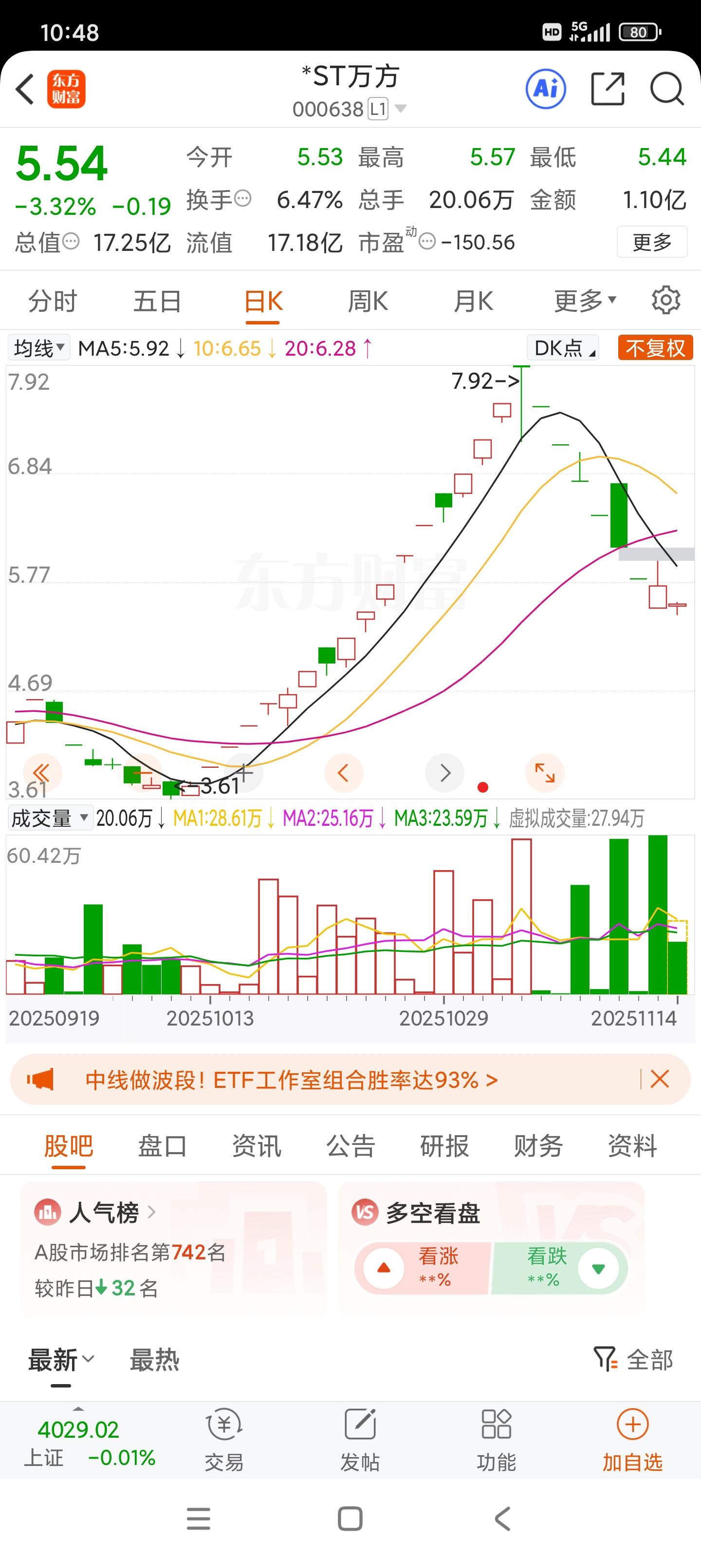 $*ST万方(SZ000638)$ 昨天收放量倒锤头,5.5左右可以考虑做短炒。
