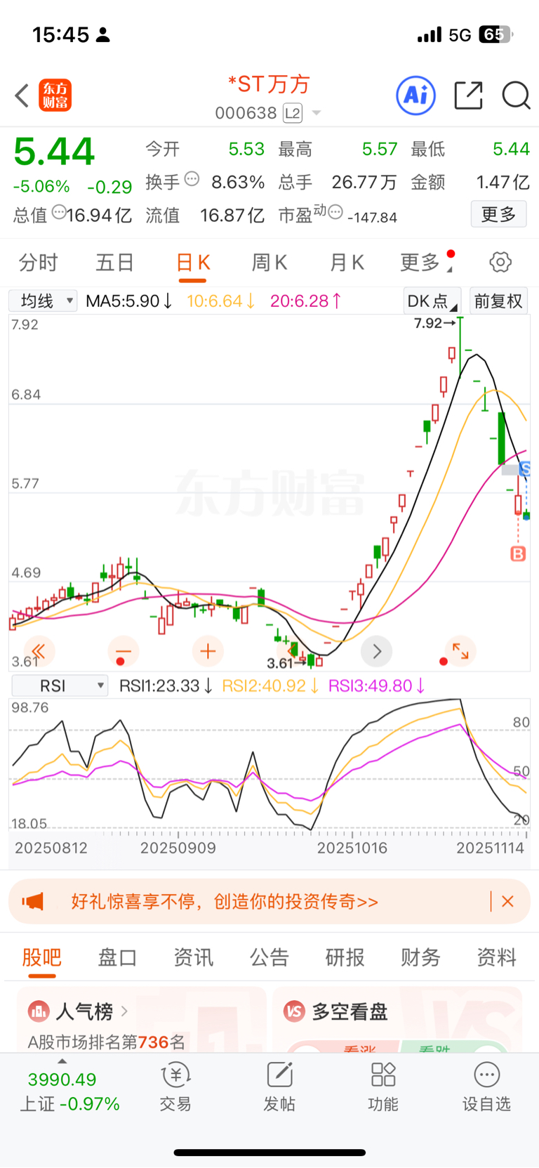$*ST万方(SZ000638)$ 昨天跌停进入,今日开盘不及预期,集合竞价一键平仓,到下一个平台4.8左右再考虑试仓