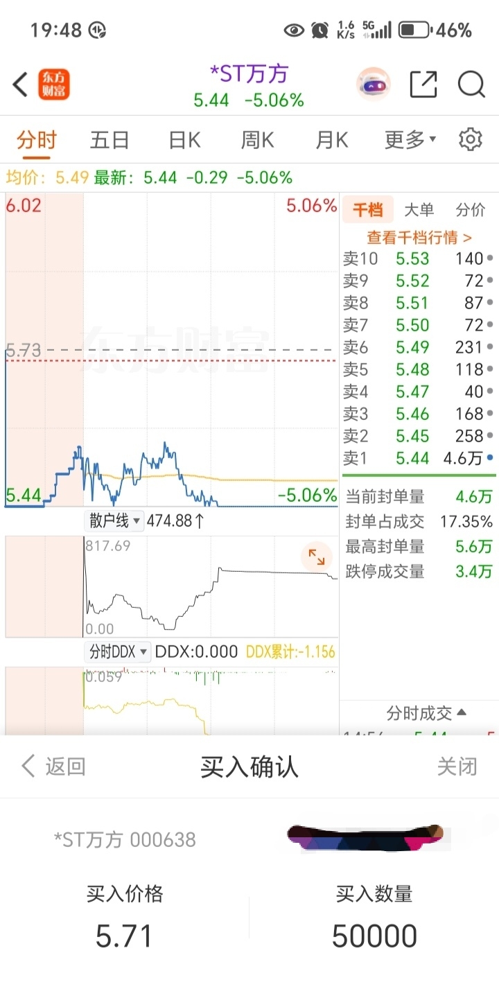 $*ST万方(SZ000638)$ 这下完蛋了,下个星期一有可能买不到了。为了第一时间进,我只能挂隔夜单,涨停板买了