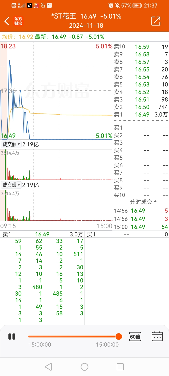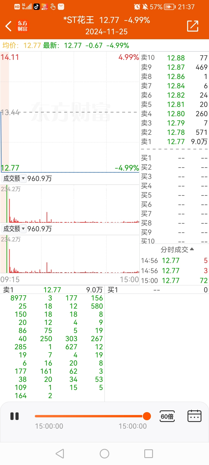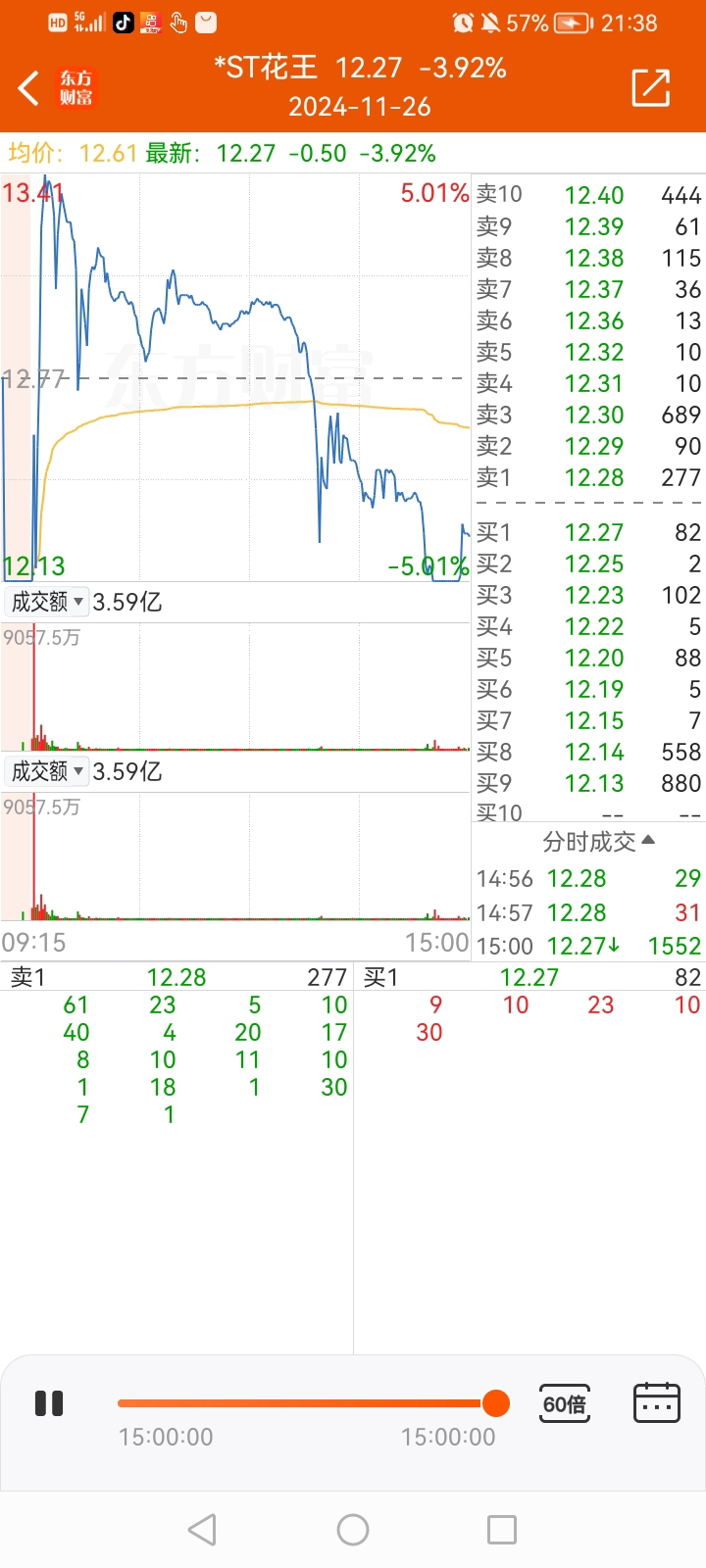 $*ST万方(SZ000638)$ $*ST花王(SH603007)$ 万方和花王的主力一样,去年花王从11月18号到11月27号打压了八个跌停,然后花王11月28号高开秒板,29号一字涨停走二波!周一万方还会给上车的机会吗???
