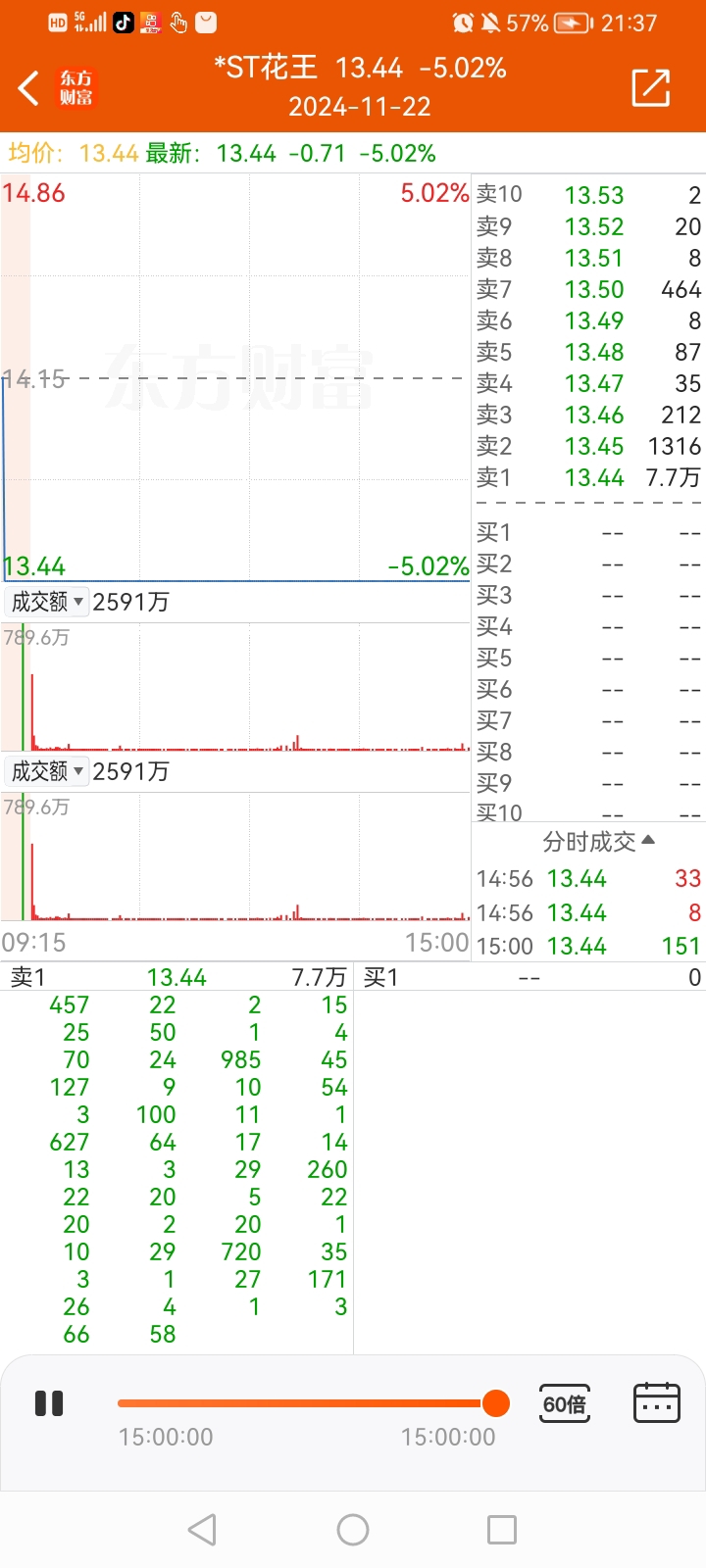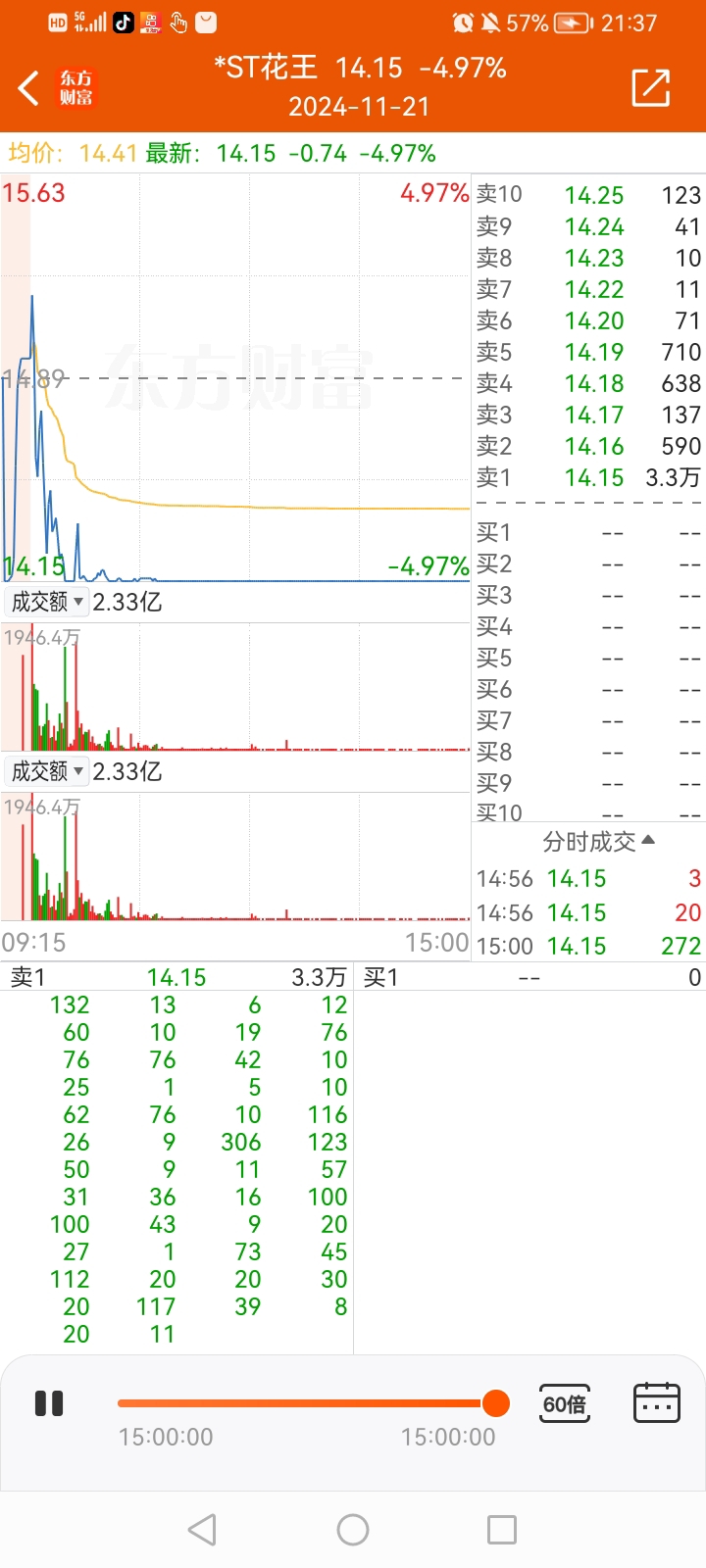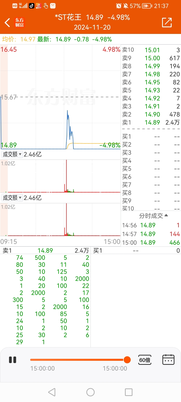 $*ST万方(SZ000638)$ $*ST花王(SH603007)$ 万方和花王的主力一样,去年花王从11月18号到11月27号打压了八个跌停,然后花王11月28号高开秒板,29号一字涨停走二波!周一万方还会给上车的机会吗???