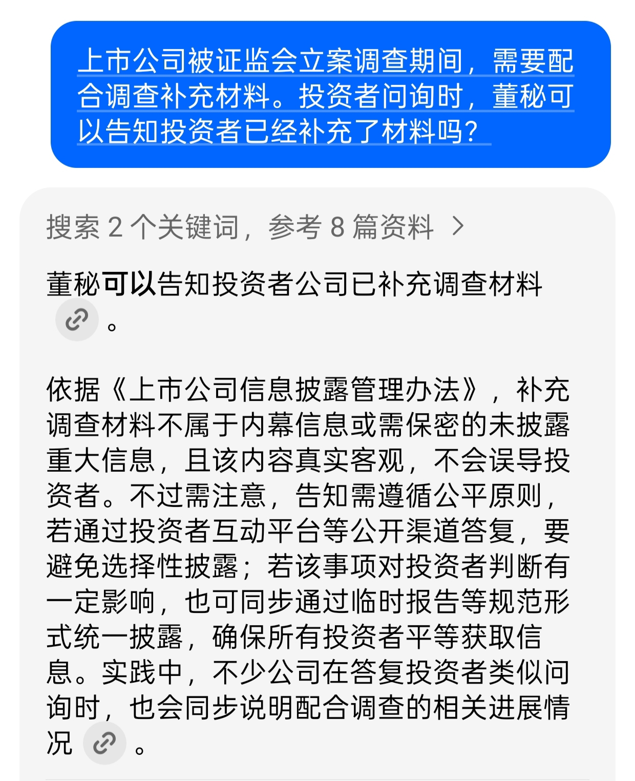 问公司是否配合调查补充了材料,竟然回答说及时补充也不能说,需要保密。但是,上市公