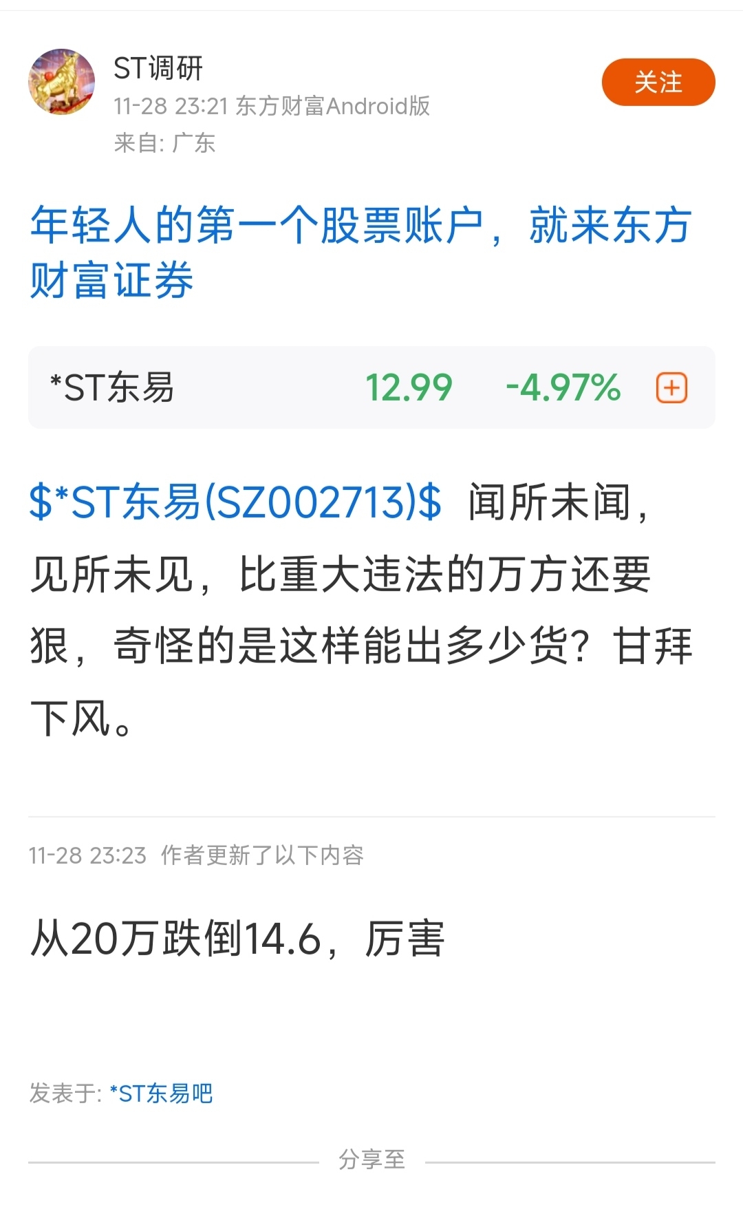 $*ST万方(SZ000638)$ 这个人还有五百多个粉丝,好歹也算个小v,还在拿万方董秘自己凭空捏造的利空说事,也信了以张校长为首的踏空大v,没明白万方第二波行情炒作逻辑,也没明白东易为何7个地板而且没有开板迹象$*ST东易(SZ002713)$ $ST中迪(SZ000609)$