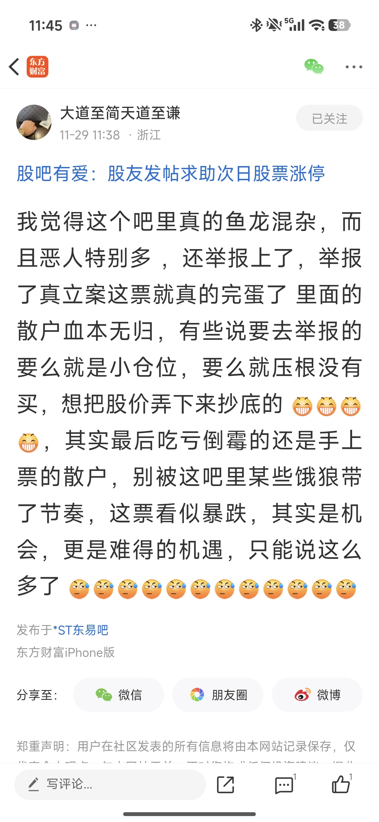 $*ST万方(SZ000638)$ 注意大道股神又在东易那边唱多了。东易7个跌停是回调,万方8个跌停是A杀。股价越低越买都是大道股神忽悠别人的话术。他被套出不去又怕被举报立案,大家一起去证监会帮他举报东易恶庄操纵股价让东易退市立案!太可恶了。@大道至简天道至谦 $*ST东易(SZ002713)$ $ST中迪(SZ000609)$