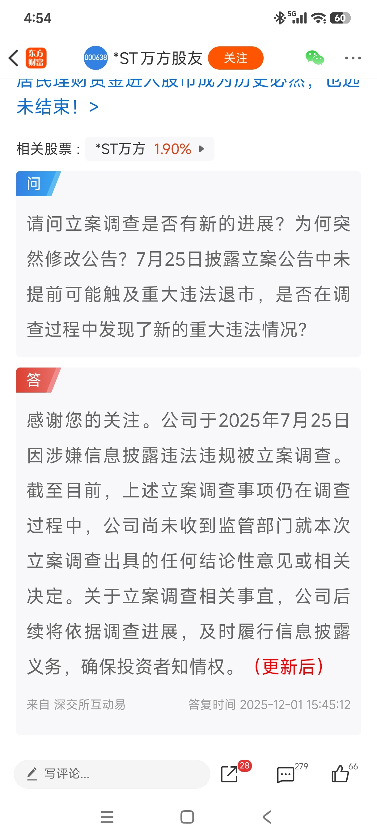 $*ST万方(SZ000638)$ 万方不触及重大违法退市,改正了,如果改正了还触及重大违法退市,上市公司要担责,误导投资者!重大利好,看晚上公告,叠加12月过户公告,面板,红酒,美女都会有的