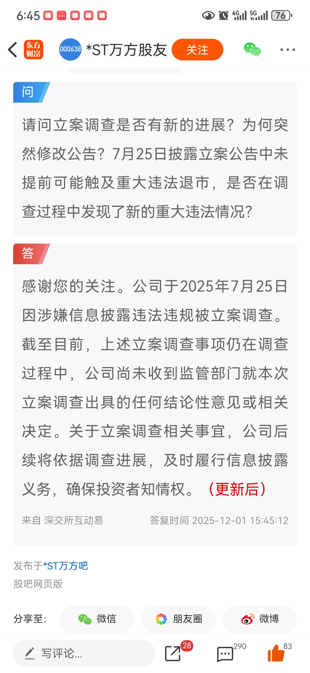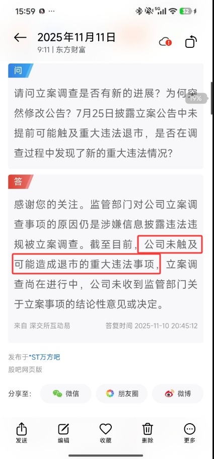 $*ST万方(SZ000638)$ $二股东双阳银行40天前说终止减持,现在又来减持,这种行为也是绝了,再加上董秘修改了11月10日投资者的回复,把“截至目前,公司未触及可能…事项”删除了!以上2种信号值得警惕