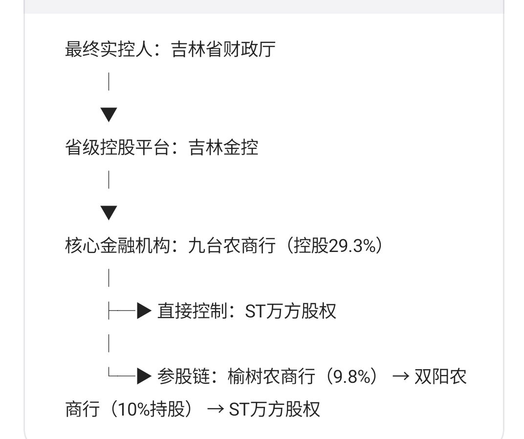 $*ST万方(SZ000638)$ 发现股吧和雪球的认知真的不是差了一丁半点,小说结论:想要顺利完成股权划转,双阳银行现在必须要减持清空,否则九台面临30%以上控股比例触发对万方的强制要约收购,看看双阳和九台农商之间的关系