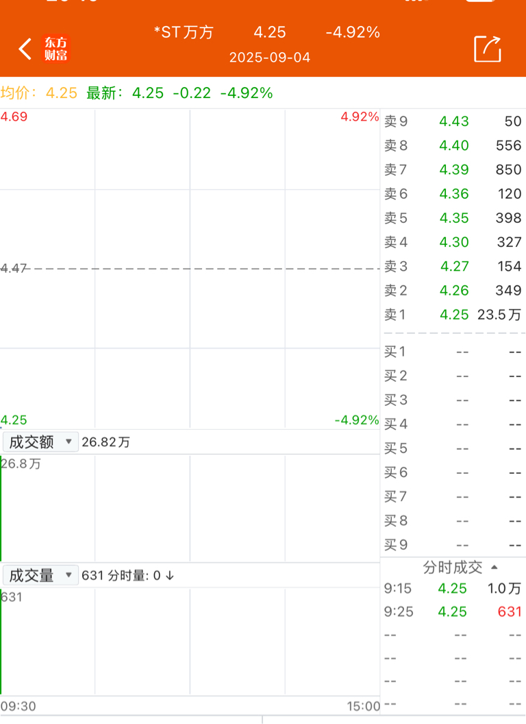 $*ST万方(SZ000638)$ 我之前就说过唱空只会让你吃不了大肉,但是唱多的会把你挂山顶或者一分不剩,9月4号那天流拍+减持两大利空20多万手封单,现在是减持+退市风险倍数增长,明天虽说没有100万手封单来个50万手不过分吧?这下总该有人信我了吧?以后股吧凡事有唱多的你们拉黑就行