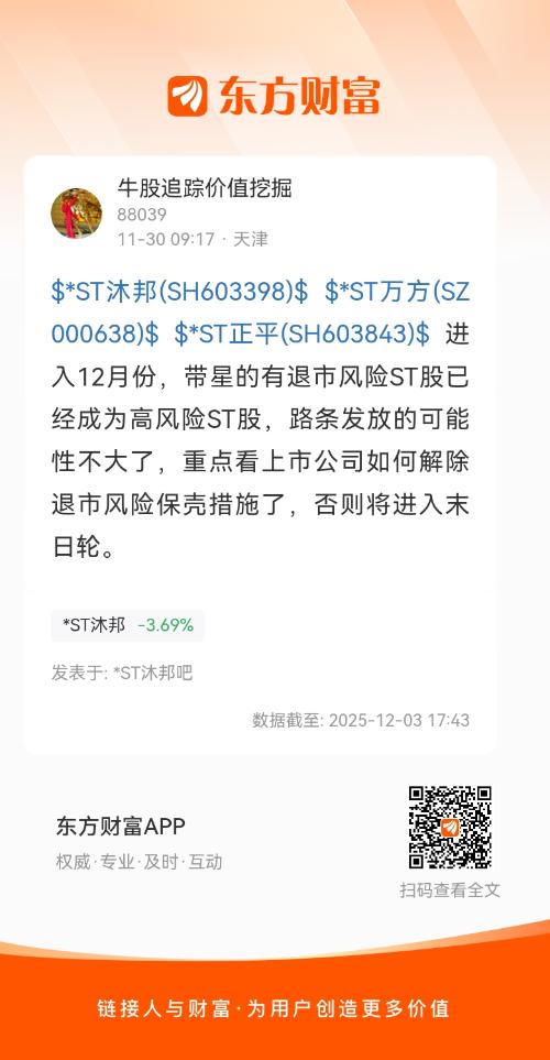 $*ST万方(SZ000638)$$*ST正平(SH603843)$$*ST沐邦(SH603398)$周末我发贴子提醒大家进入12月份小心带有退市风险警示的沐邦、万方、正平因为年报非标问题、业绩持继恶化,资金违占等问题在12月底以前没有得到改善,25年年报还是非标,这些公司将面临退市。触动了某㘹大V的利益,大V和小弟在我评论区疯狂输出,一会说法院受理预重整了重整没问题,一会又说预重整受理不一定拿到路条,至少年报前没有问题。这言论真是左右脑互博,沐邦本周三个交易日股价从9.5下跌到8.36元,跌幅12%不知道该大V是否满仓持有沐邦,如果没有那他就是个带节奏的庄托,忽悠误导大家。
