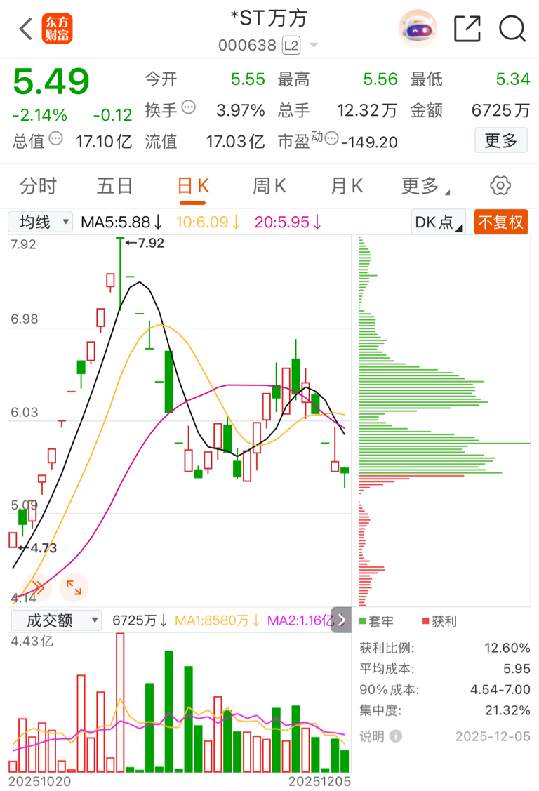 $*ST万方(SZ000638)$ 上面全是套牢盘谁敢来拉,救你只需要几十万,拉几个涨停可是要几个亿,主力还是会算账的