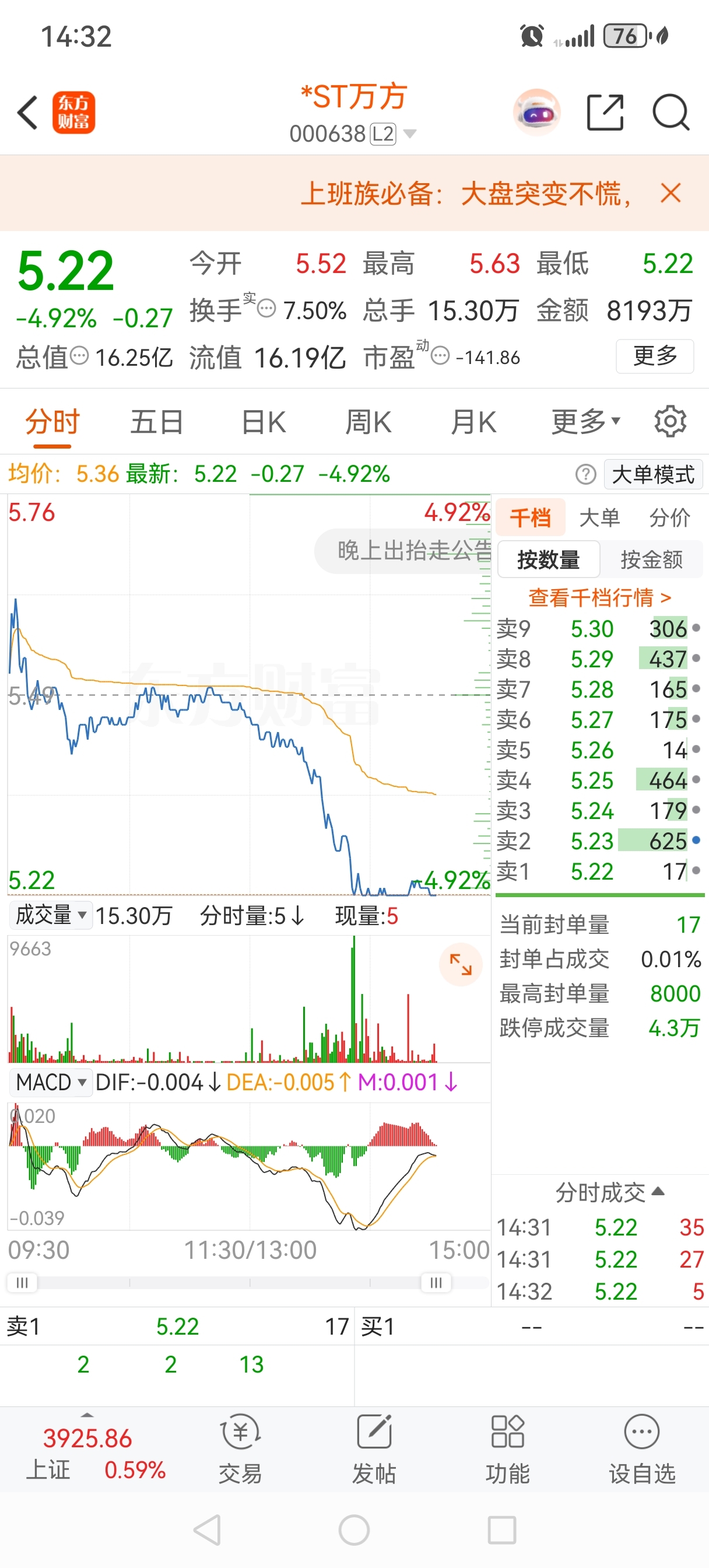 $*ST万方(SZ000638)$ 一只股票,22手封住跌停,你们想想,散户都被套住了,不卖了,庄再制造恐慌,也没人卖,这就是变盘的节点,今天话多一点,坚持住,这是黎明前最后的低点了,尾盘绝对会拉起来。