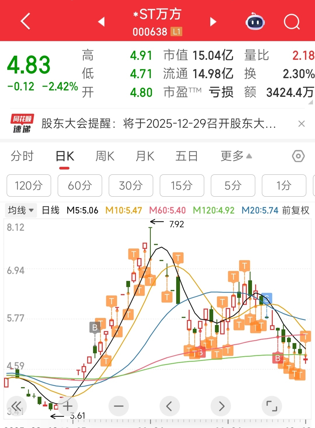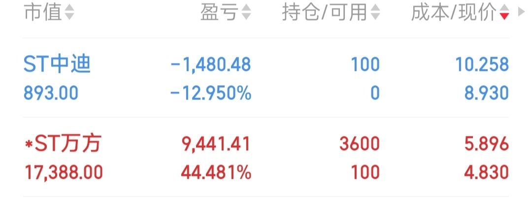 $*ST万方(SZ000638)$ 万方10月21开始建仓,7.92开始到11月11号涨停加仓后连续跌停由暴赚到巨亏,11月14号企稳重仓买入到28号又赚回来了,28号开始高抛低吸做t到今天,一路下跌居然小赚,现在仓位轻,等企稳了再重仓操作,中迪操作了几次,头天抄底的第二天竞价就跑,小亏$ST中迪(SZ000609)$ $*ST东易(SZ002713)$