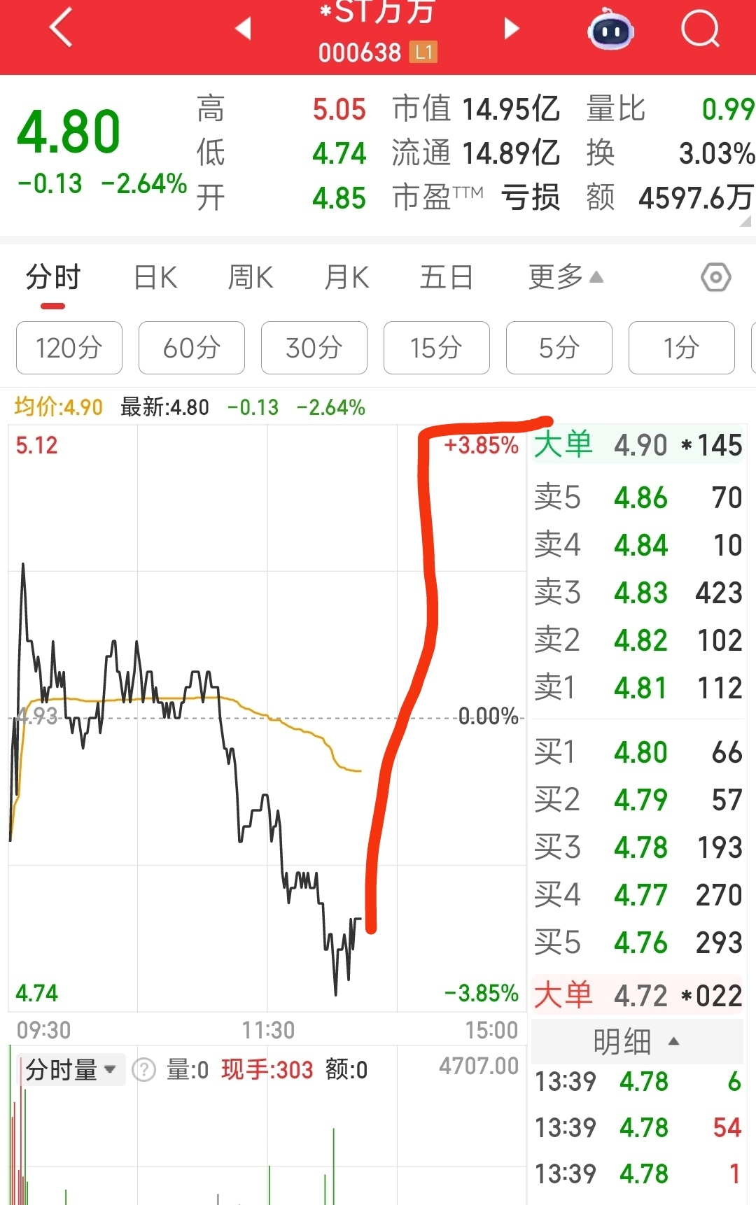 $*ST万方(SZ000638)$ 今天再绿就是十天没涨了,主力再憋大招,两点钟预计这样走