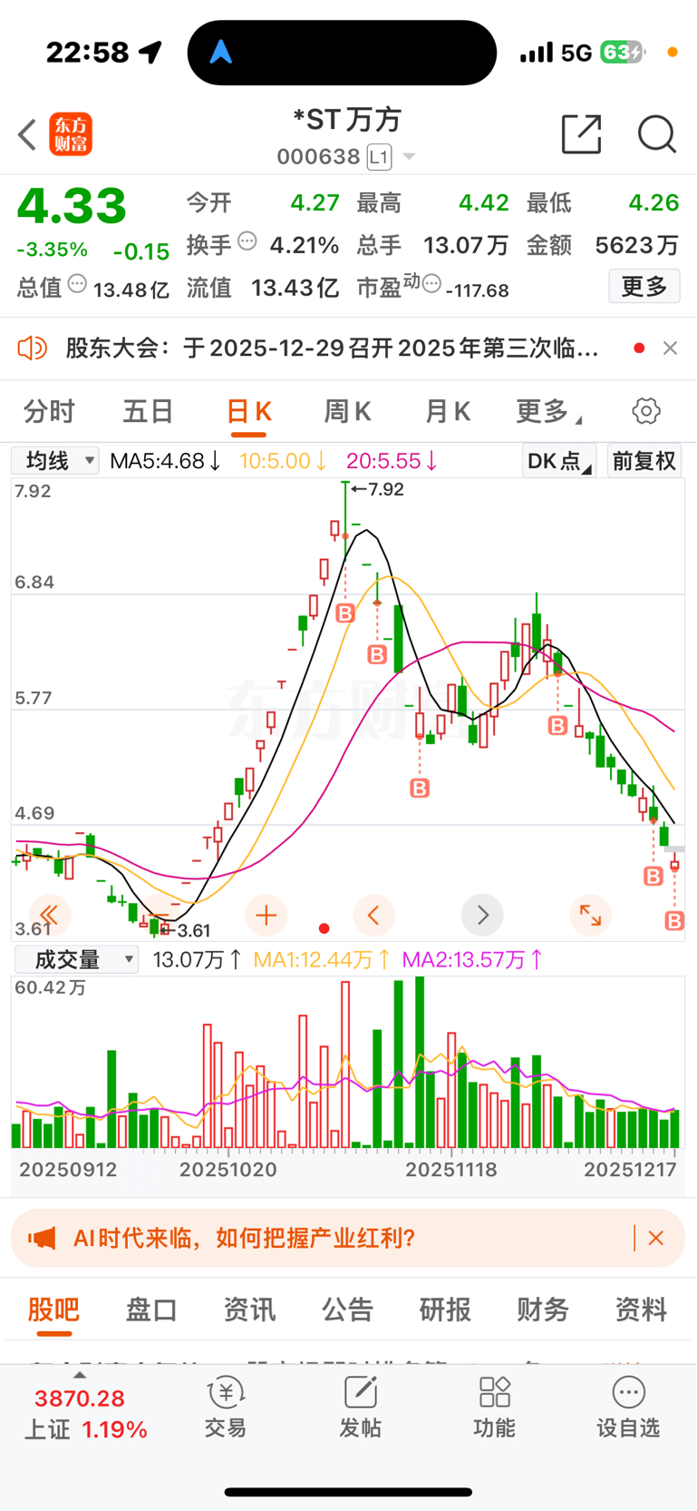 $*ST万方(SZ000638)$ 一股没卖还加了几次仓,我还能回本吗?