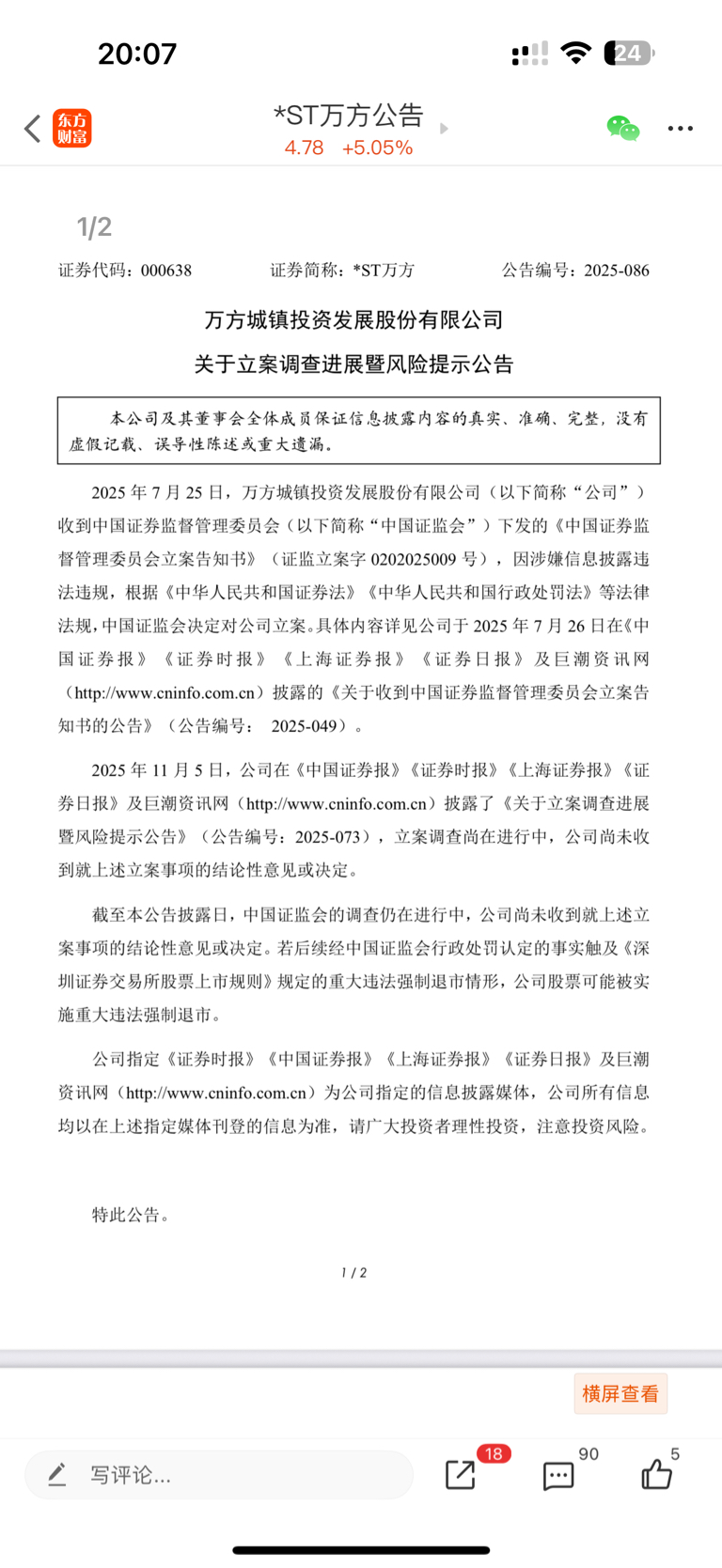 $*ST万方(SZ000638)$ 必退,不退倒立拉稀,和ST立方一样,出立案调查结果就是退市之日!