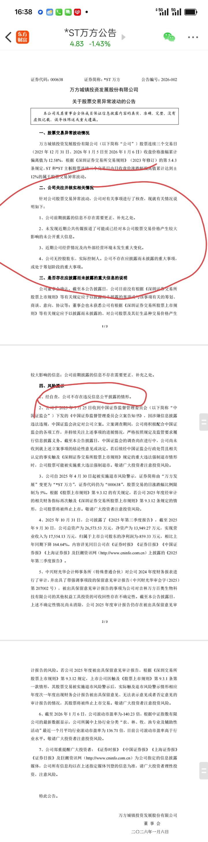 $*ST万方(SZ000638)$ 还是强调自己没有信息不实等问题。