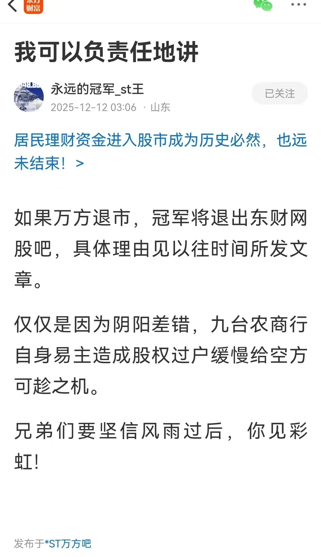 $*ST万方(SZ000638)$ 你们有多少人是他的粉丝?这种无良大v,坑害了多少人?今夜注定好多人无眠,悲剧重演。看万方退市,直接删除帖子,殊不知互联网有记忆的。