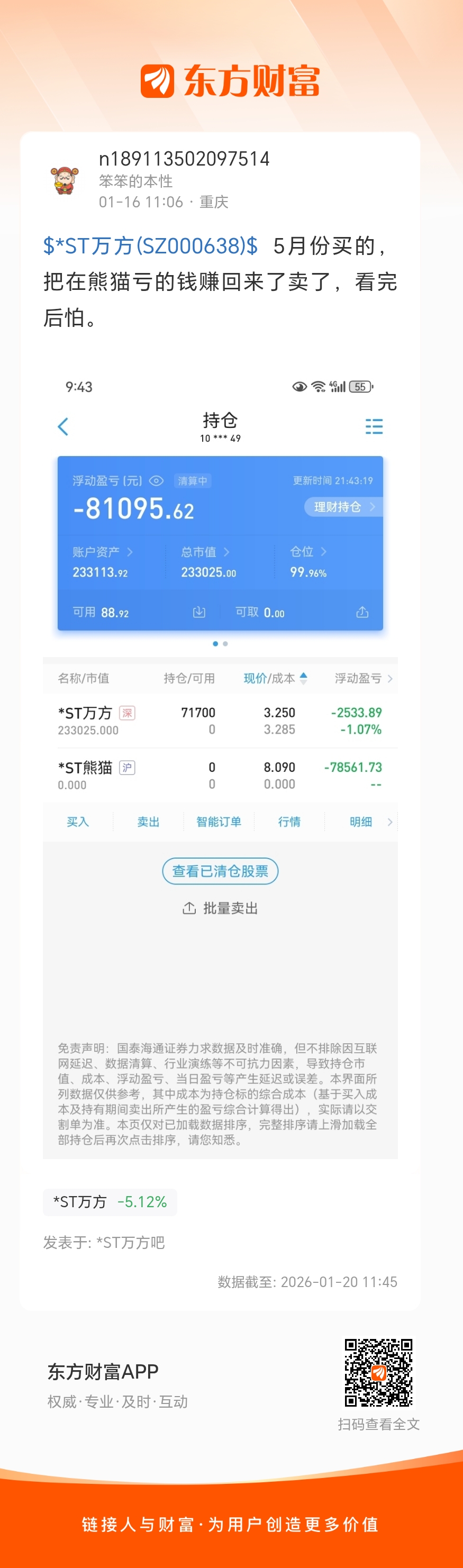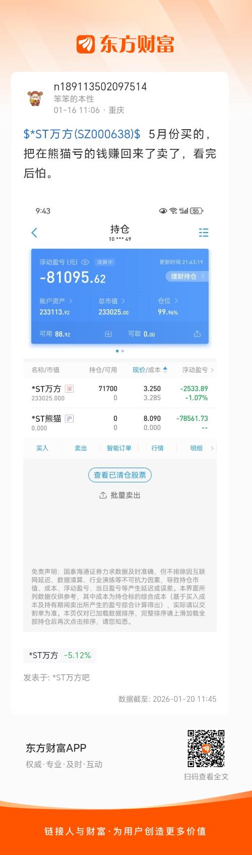 $*ST万方(SZ000638)$  5月份买的,把在熊猫亏的钱赚回来了卖了,看完后怕。