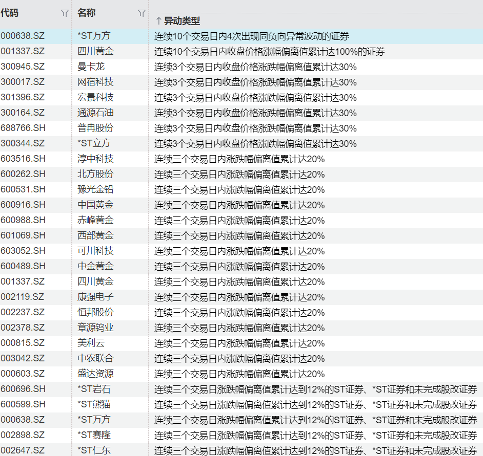 *ST岩石、*ST熊猫、*ST万方等连续三个交易日涨跌幅偏离值累计达到12%。