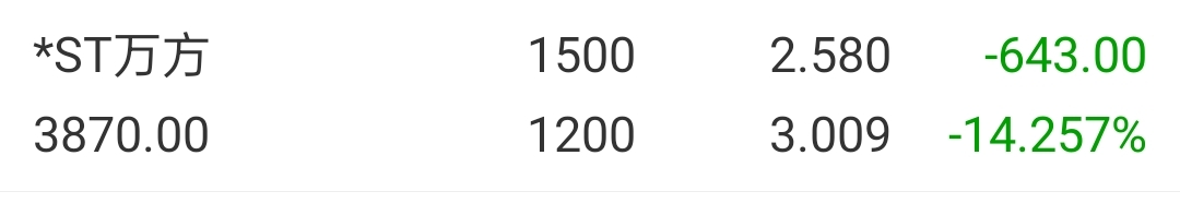 $*ST万方(SZ000638)$ 抄底抄在半山腰,亏了643块钱了
