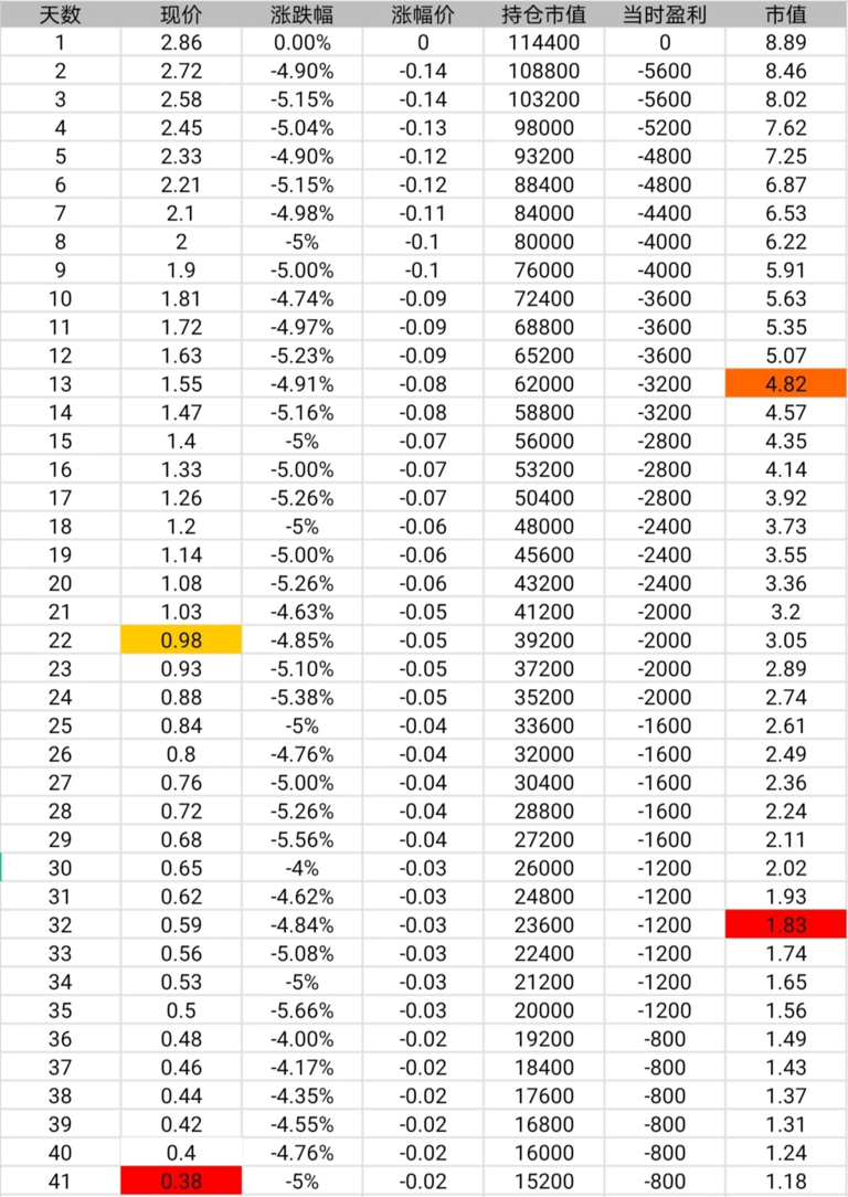 预计还有18个跌停板,市值连续不足5亿元,股价0.59元,三板见了,各位兄弟姐妹