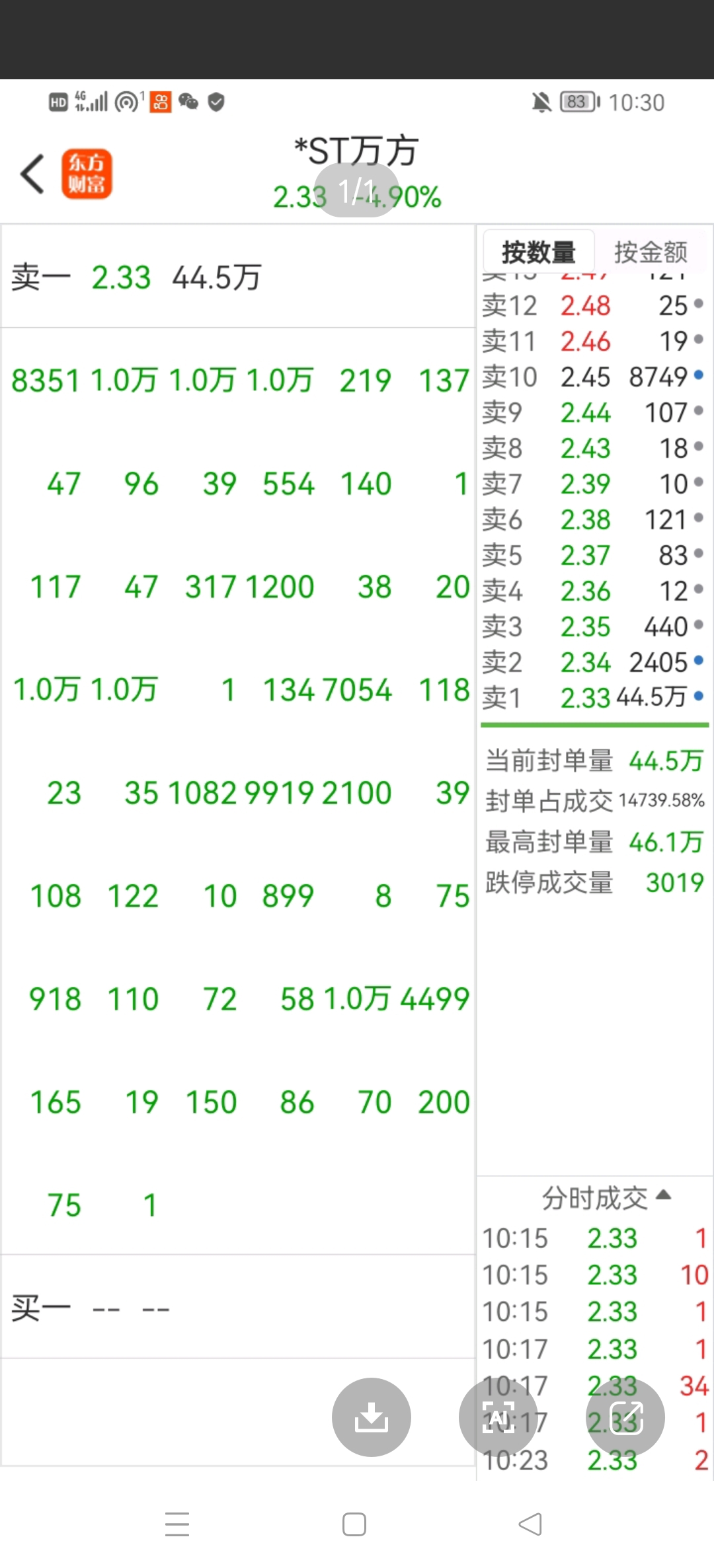 $*ST万方(SZ000638)$ 话不多说,赶紧挂单吧,我早上已经挂了,希望三天后能让我出去就行了,封单量越来越大,成交量越来越小,标准的闷杀去三板了。
