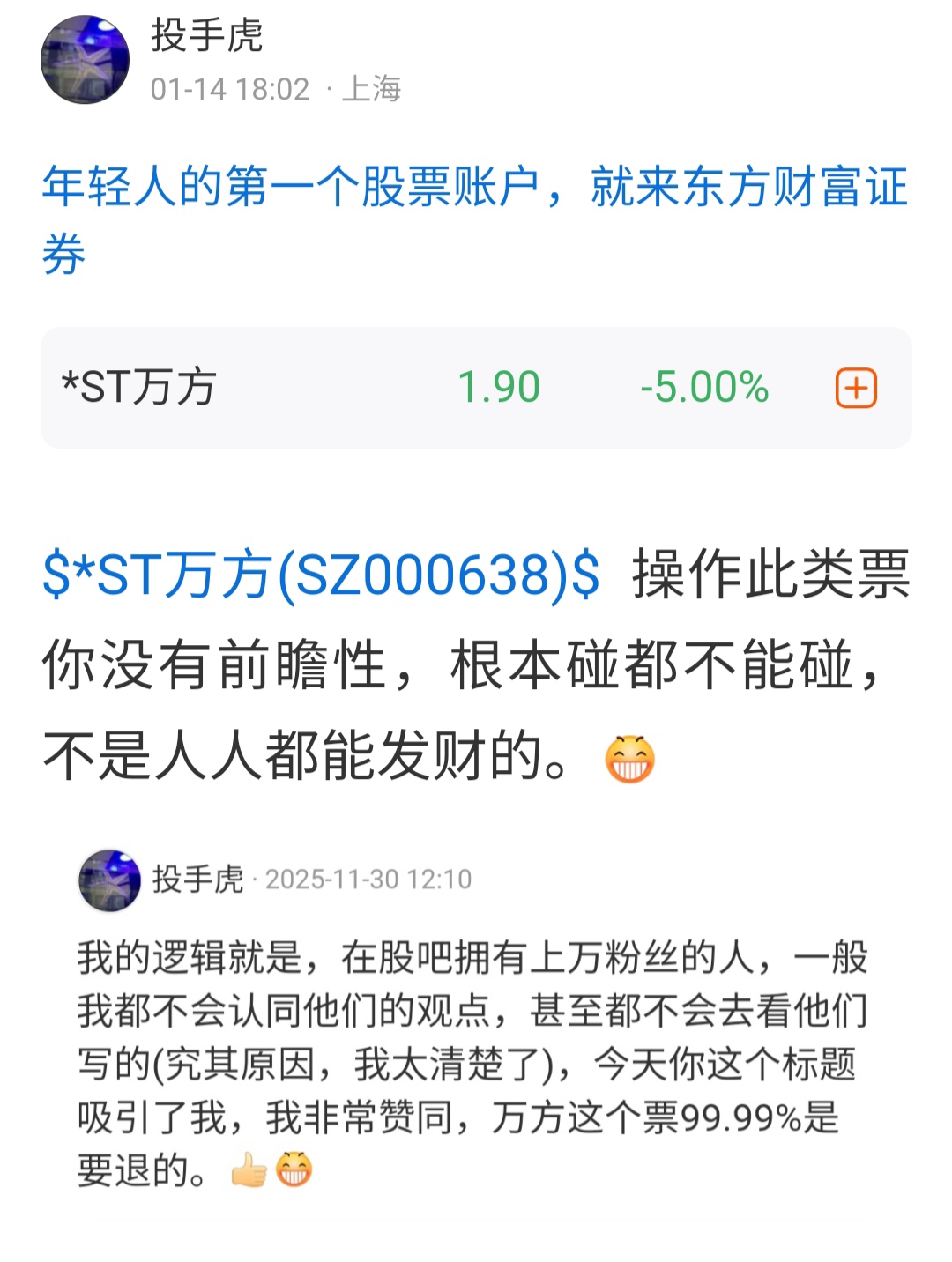 郑重声明:用户在财富号/股吧/博客等社区发表的所有信息(包括但不限于文字、视频、音频、数据及图表)仅代表个人观点,与本网站立场无关,不对您构成任何投资建议,据此操作风险自担。请勿相信代客理财、免费荐股和炒股培训等宣传内容,远离非法证券活动。请勿添加发言用户的手机号码、公众号、微博、微信及QQ等信息,谨防上当受骗!