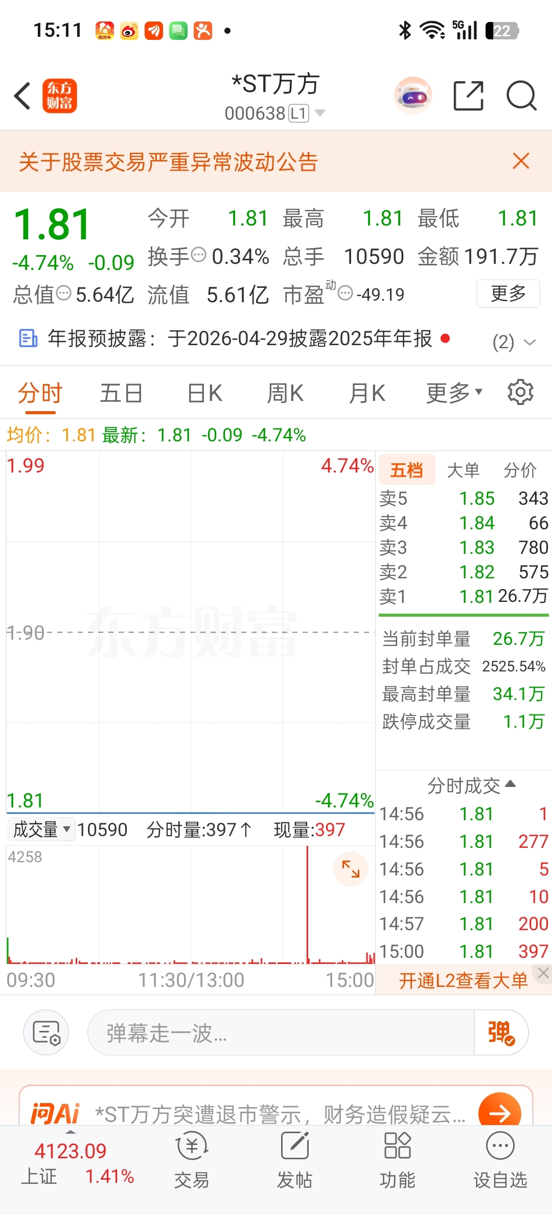 $*ST万方(SZ000638)$ 终于有一条红线了,有量了,明天开板机会很大