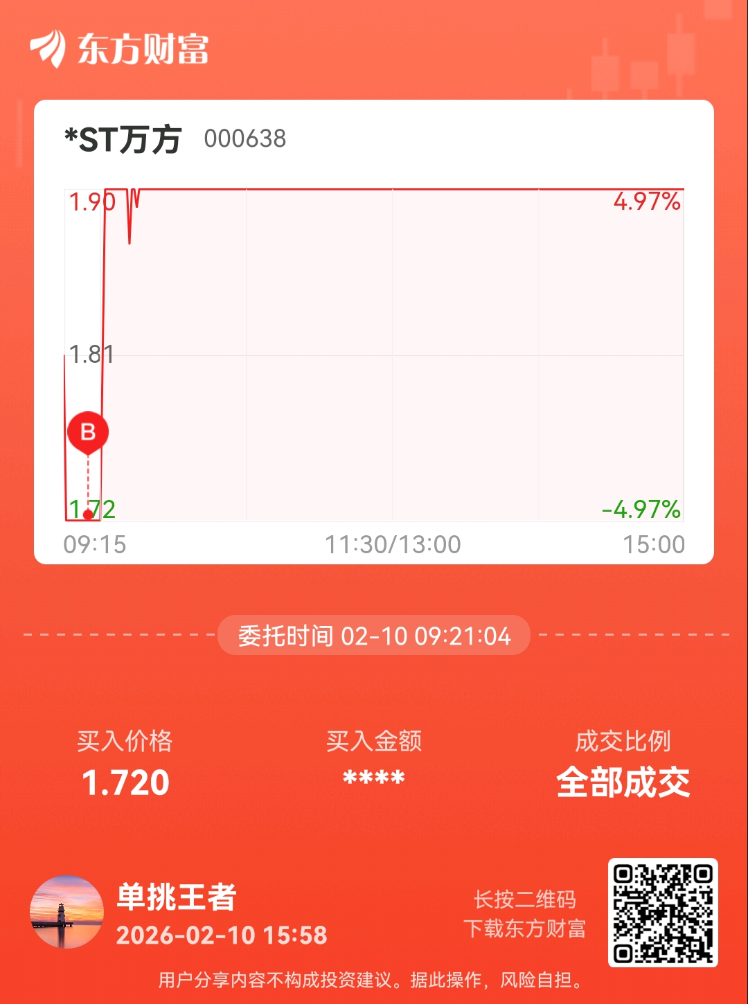 温馨提示: 1.根据《证券法》规定,禁止编造、传播虚假信息或者误导性信息,扰乱证券市场;2.用户在本社区发表的所有资料、言论等仅代表个人观点,与本网站立场无关,不对您构成任何投资建议。用户应基于自己的独立判断,自行决定证券投资并承担相应风险。《东方财富社区管理规定》