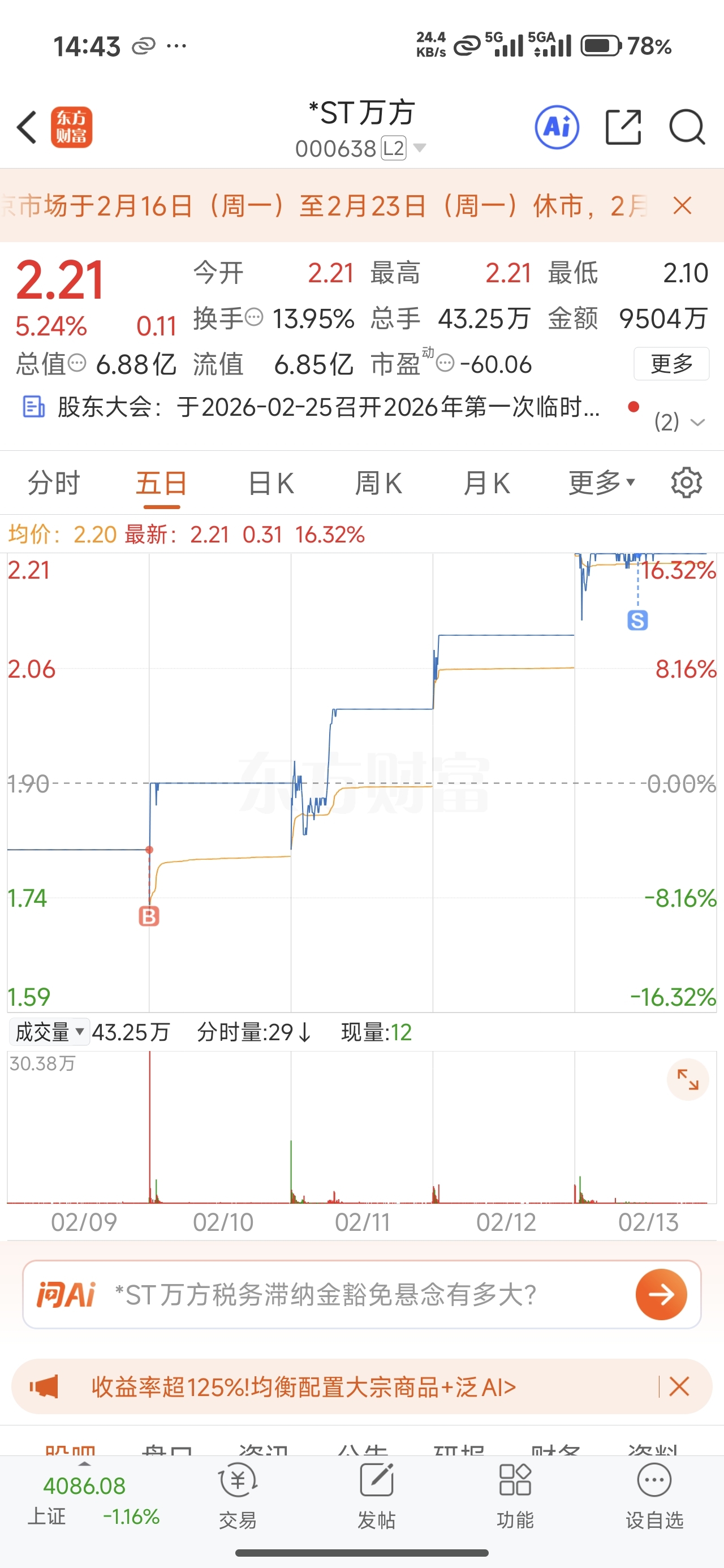 $*ST万方(SZ000638)$ 不格局了,我先撤了,假期拿着风险太大,希望兄弟们吃肉,别做最后那一棒,留下的发财,江湖再见