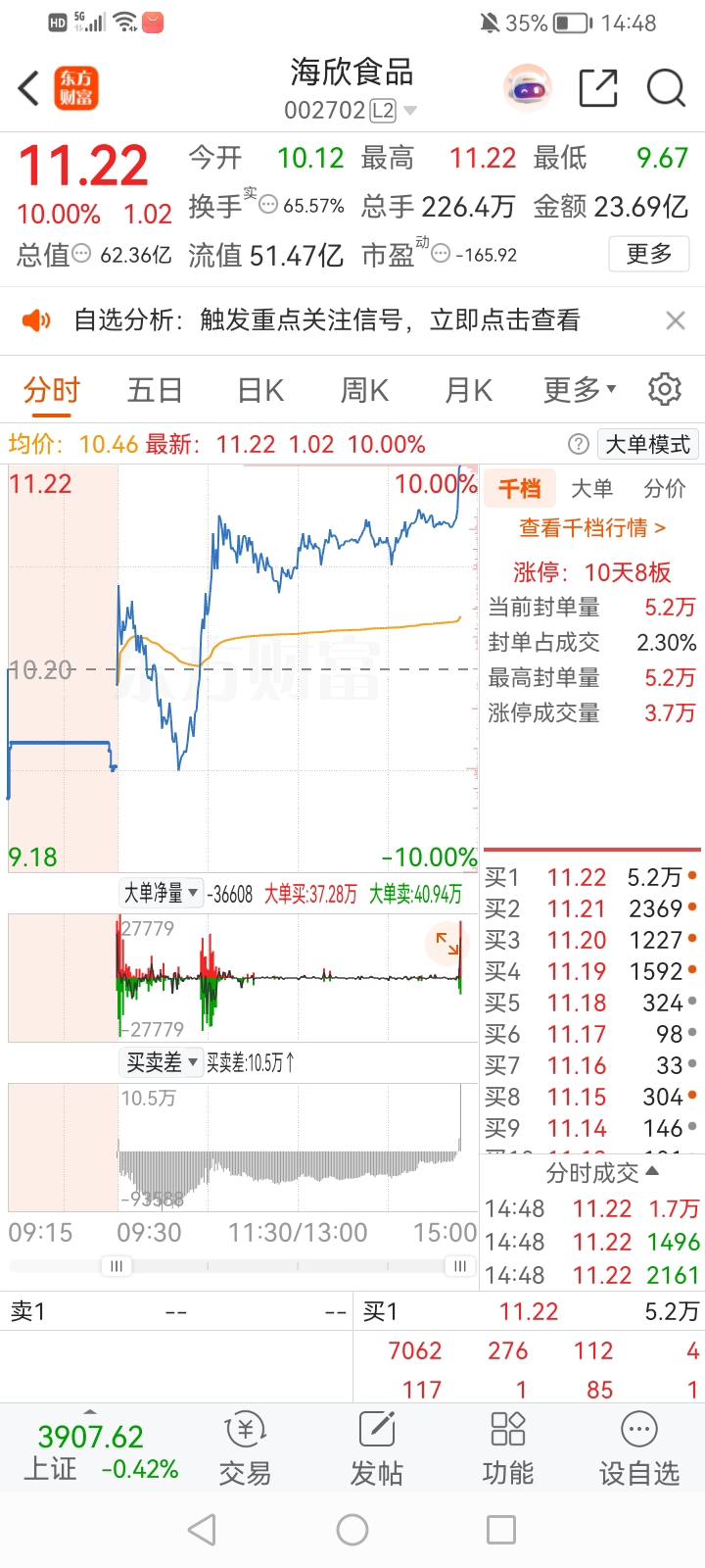看看消费龙头海欣食品十天八板,可惜我昨天买了西王食品,买股必须买龙头股,低位砸毛