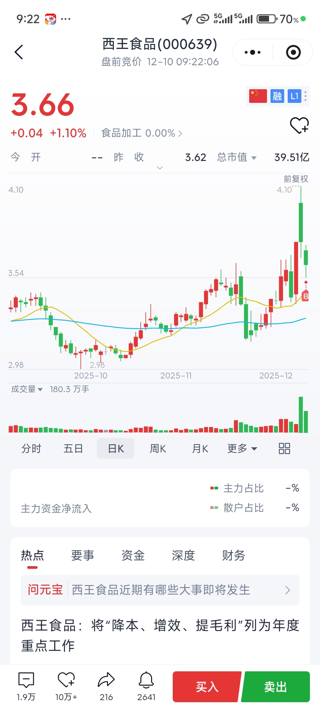 $西王食品(SZ000639)$ 大哥先先别涨啊,昨天才上车