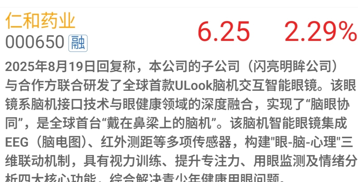 $仁和药业(SZ000650)$ 这股回复中说,脑机交互智能眼镜实现了脑眼协同,这说明智能眼镜已经制造成功,但股价表现,又像智能眼镜没有成功。