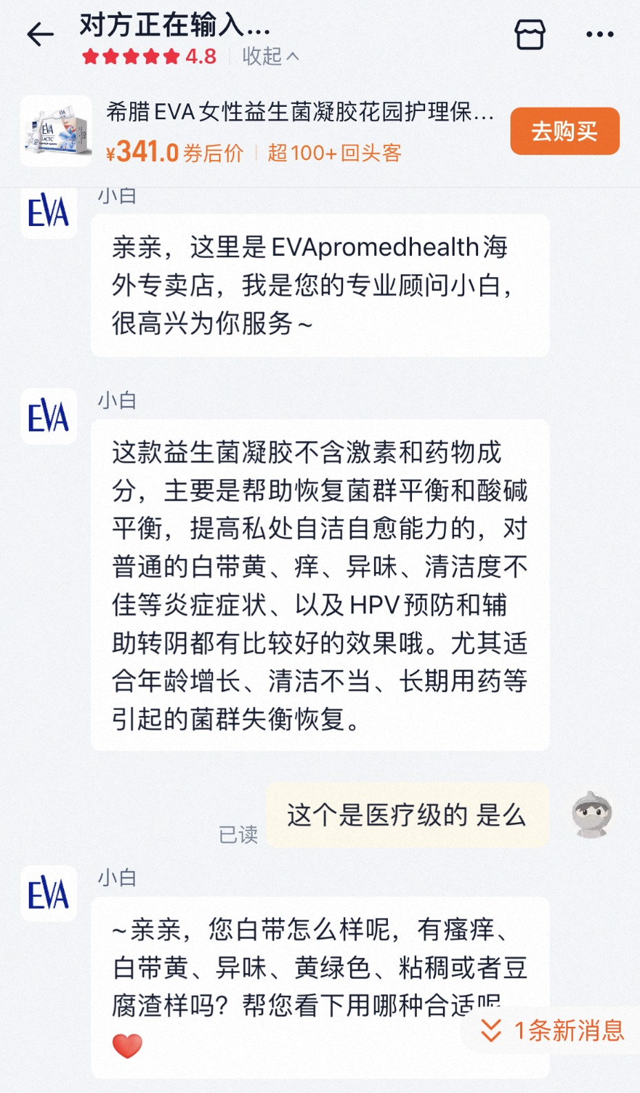 EVApromedhealth海外专卖店的客服则表示,希腊EVA女性益生菌凝胶“不含药物成分,是个人护理产品”。据电商平台信息,该跨境进口商品销售主体为Promed-health Limited。