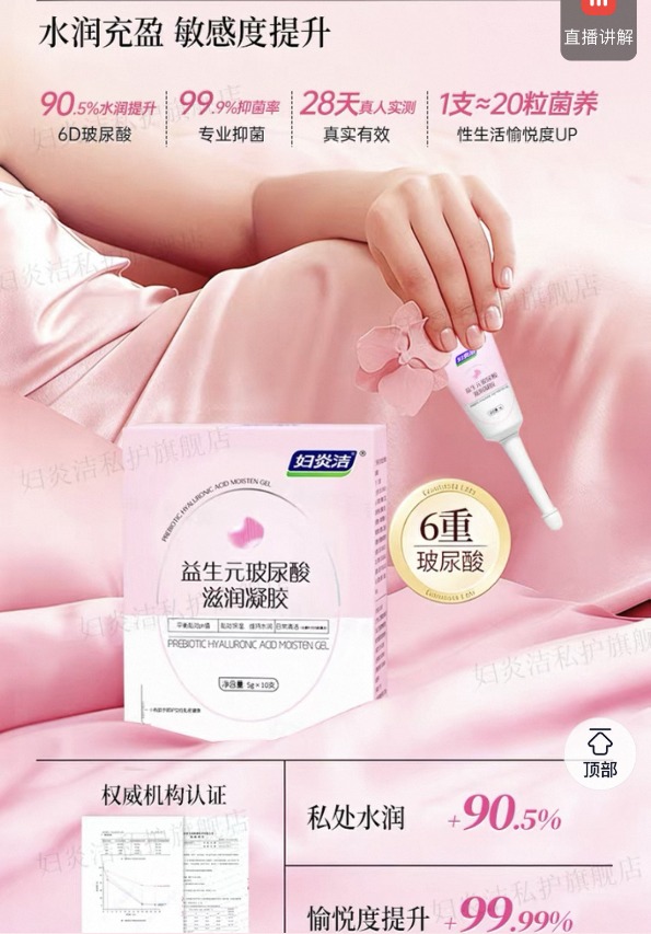 “每天一支,干净又方便”“隔天坚持用一支;能水润滋养,能平衡菌群;一招解决小花园干痒问题”,今年1月初,在某电商平台的妇炎洁私护旗舰店,视频中正在介绍的是一款名为妇炎洁益生元玻尿酸滋润凝胶的产品。
