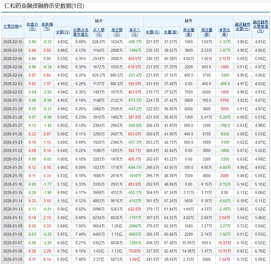 重磅!【仁和药业】截至2026.2.10最新融资融券数据“指明”:“马年春节”前