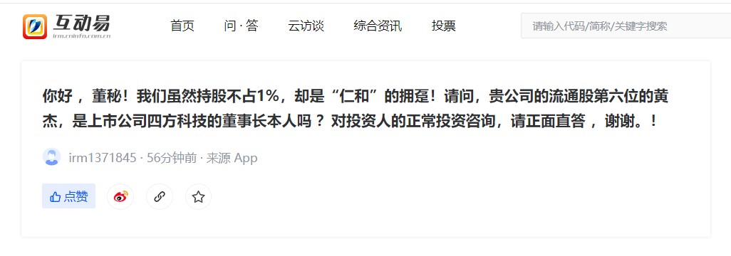 来者非凡!深交所互动易**仁和药业:请问,贵公司的流通股第六位的黄杰,是上市公司四方科技的董事长本人吗 ?对投资人的正常投资咨询,请正面直答!