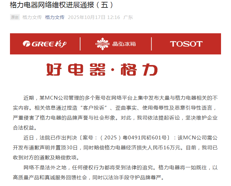 近日,法院已作出判决〔案号:(2025)粤0491民初601号〕:该MCN公司需公开发布道歉声明并置顶30日,同时赔偿格力电器经济损失人民币16万元。目前,格力电器已收到对方的道歉及赔偿款项。