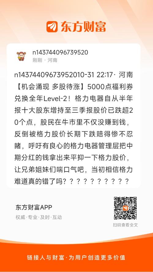 n14374409673952010-31 22:17· 河南【机会涌现 多股待涨】5000点福利券兑换全年Level-2!格力电器自从半年报十大股东增持至三季报股价已跌超20个点,股民在牛市里不仅没赚到钱,反倒被格力股价长期下跌赔得惨不忍睹,呼吁有良心的格力电器管理层把中期分红的钱拿出来平抑一下格力股价,让兄弟姐妹们喘口气吧,当初相信格力难道真的错了吗??????????