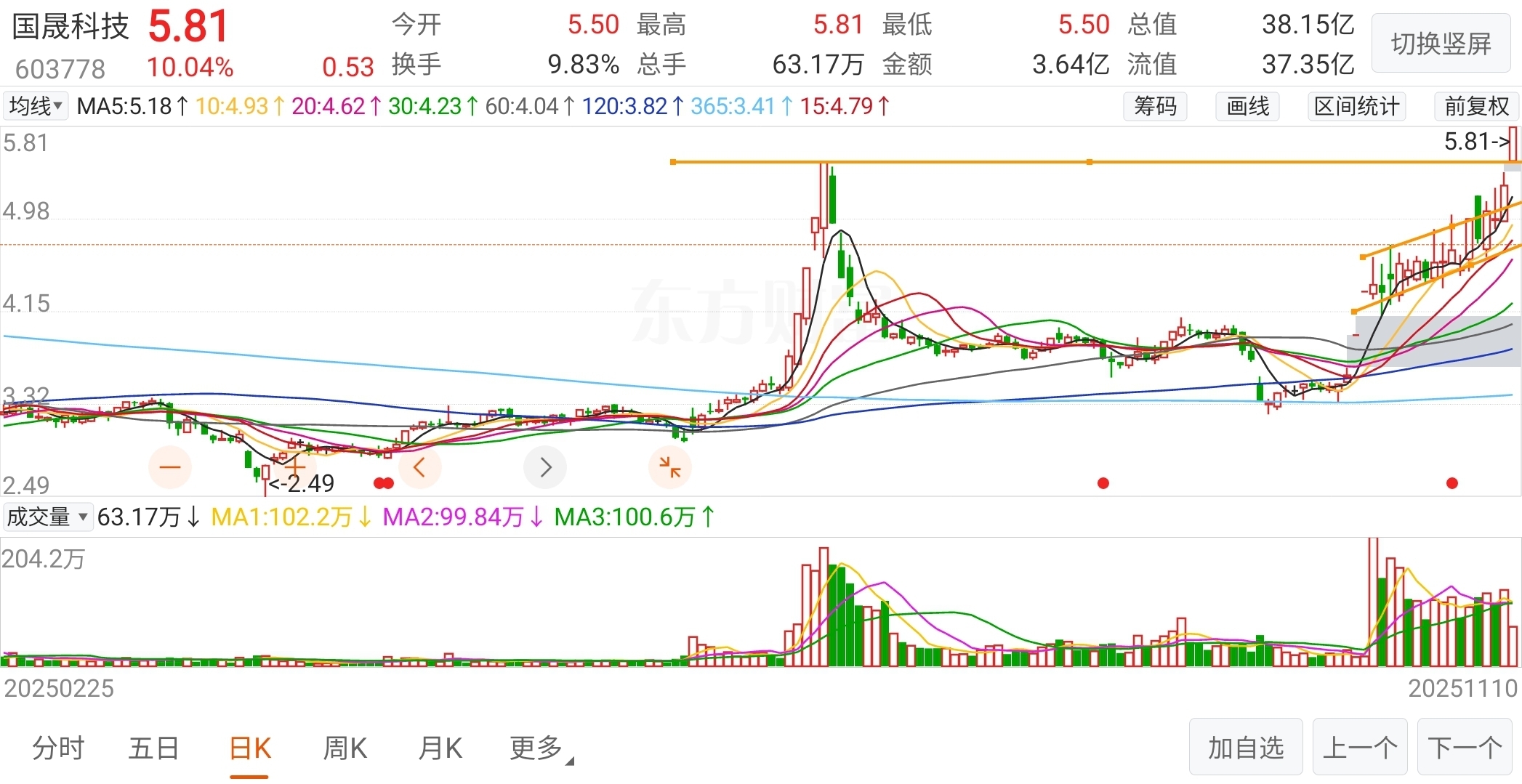 以下是我11月5号的分析内容,“单从技术形态上来看国晟科技。国晟科技形态上属于典型的五线顺上,均线向上发散,以第二个一字板为原点作x轴y轴,K线平均单位长度函数从y=0.3x逐渐变成y=x,斜率从0.3变成1逐渐上升,并且成加速上升之态,目前已经第二次突破震荡区间,随时加速主升。”
