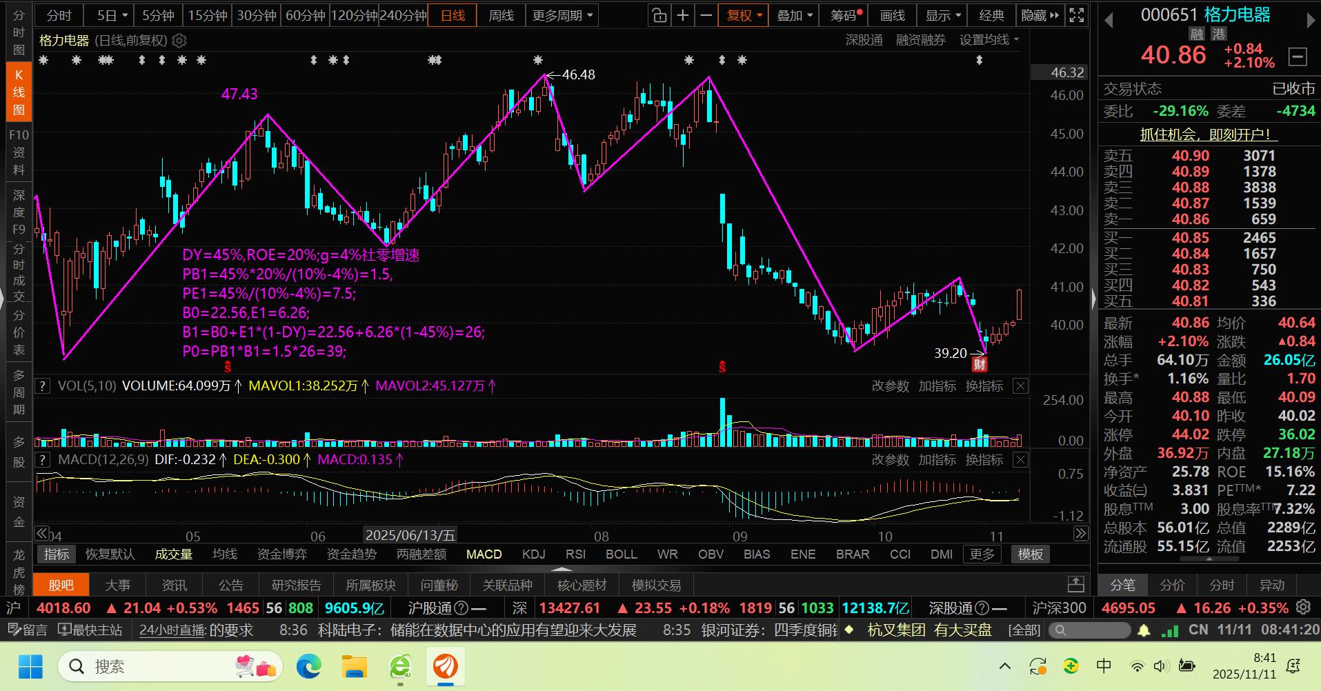 11月11日,格力到合理价位了,年初算的合理价格39,今天一看到了,技术形态也起