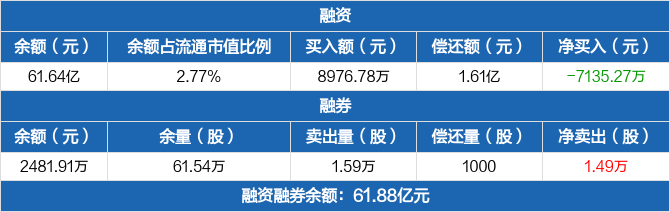 融资方面,当日融资买入8976.78万元,融资偿还1.61亿元,融资净偿还7135.27万元。融券方面,融券卖出1.59万股,融券偿还1000股,融券余量61.54万股,融券余额2481.91万元。融资融券余额合计61.88亿元。