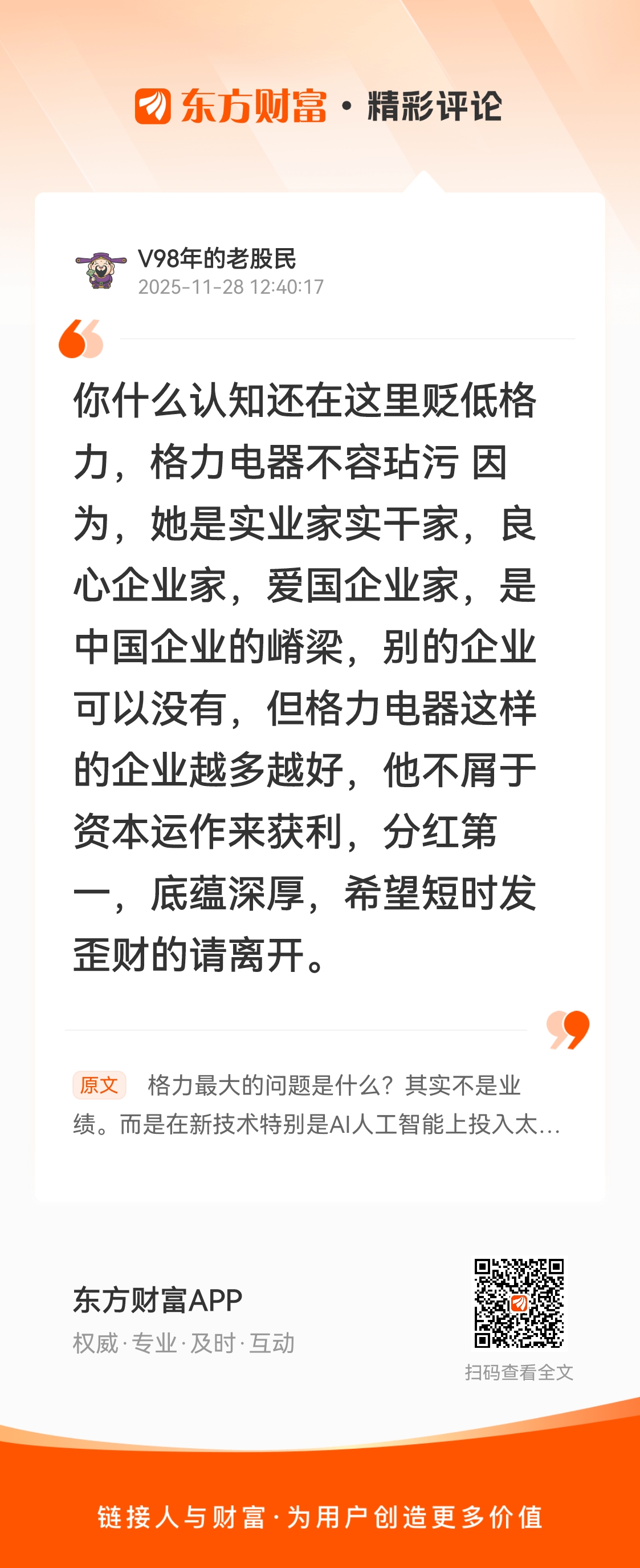 你什么认知还在这里贬低格力,格力电器不容玷污 因为,她是实业家实干家,良心企业家,爱国企业家,是中国企业的嵴梁,别的企业可以没有,但格力电器这样的企业越多越好,他不屑于资本运作来获利,分红第一,底蕴深厚,希望短时发歪财的请离开。 我在《格力最大的问题是什么?其实不是业绩。而是在新技术特别是AI人工智能上投入太少,现》的评论获得了大家的关注。