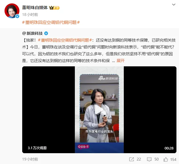 董明珠的原话其实没毛病,她承认铝代铜“技术可行”,也承认格力“研究很多年”,但坚持不用的原因是尚未达到铜同等的技术条件和保障,并强调会继续研究,直到完全替代再上。