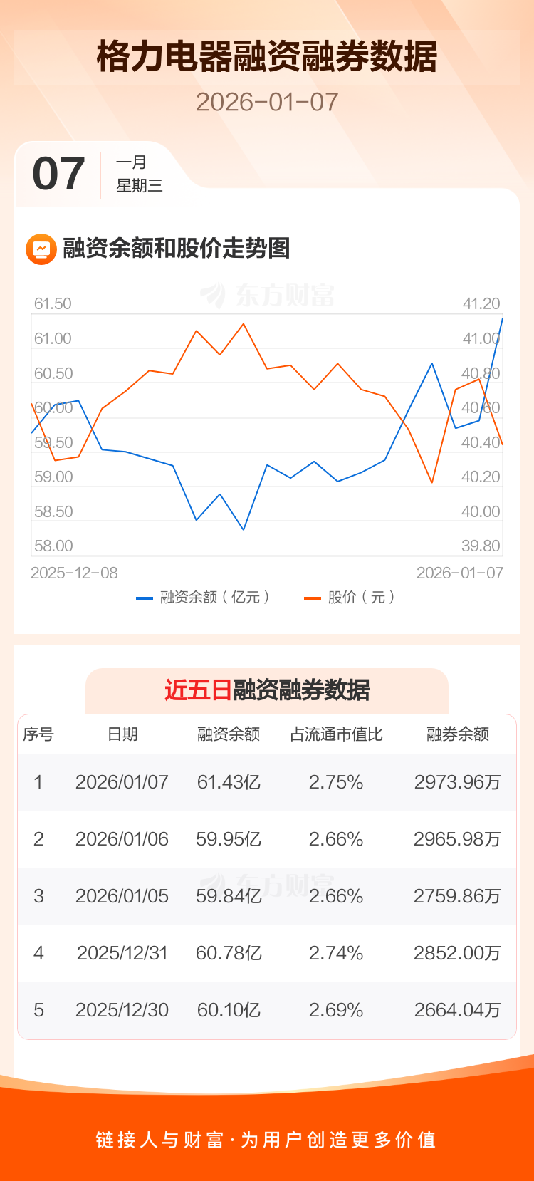 交易所最新数据显示,格力电器于2026年1月7日获融资买入2.55亿元,融资偿还1.06亿元,当日融资净买入1.49亿元。目前,该股融资余额61.43亿,占流通市值比例为2.75%。
